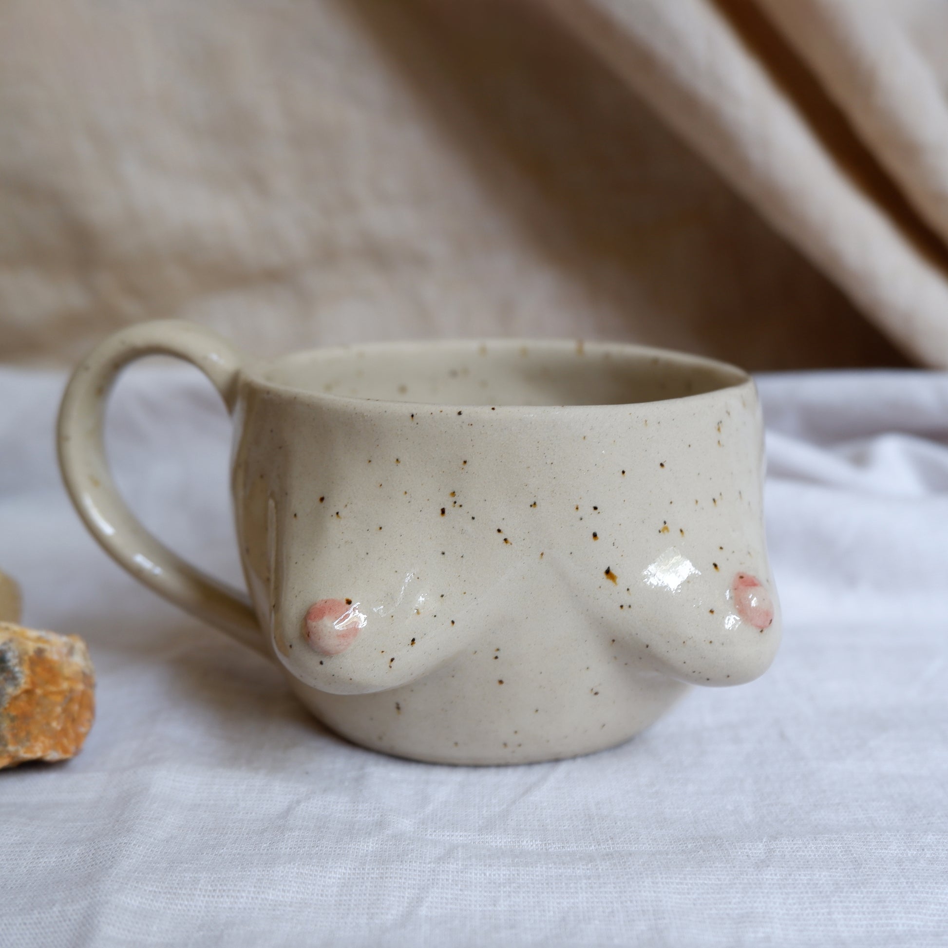 The mug is sculpted using the pinch technique from beige stoneware clay, finished with a transparent glaze and rose details.ย