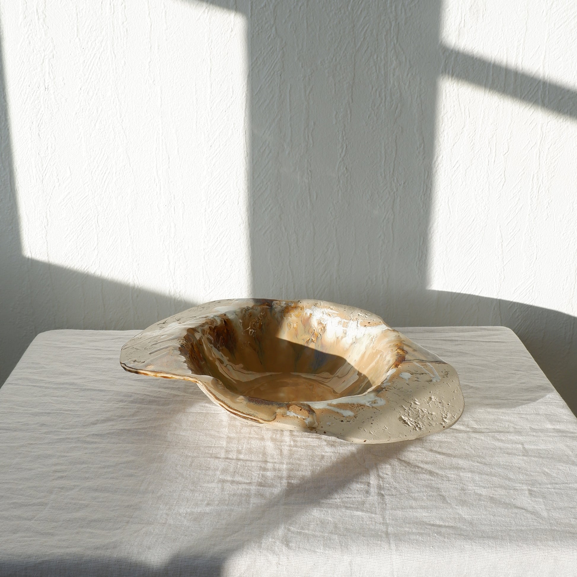 It is handmade with a slab building technique from speckled beige clay and finished with a glossy white and beige glaze. It’s both strong and versatile, making it perfect for daily use. Dishwasher safe for easy cleaning, but to preserve its handmade quality and unique finish, hand washing is recommended.