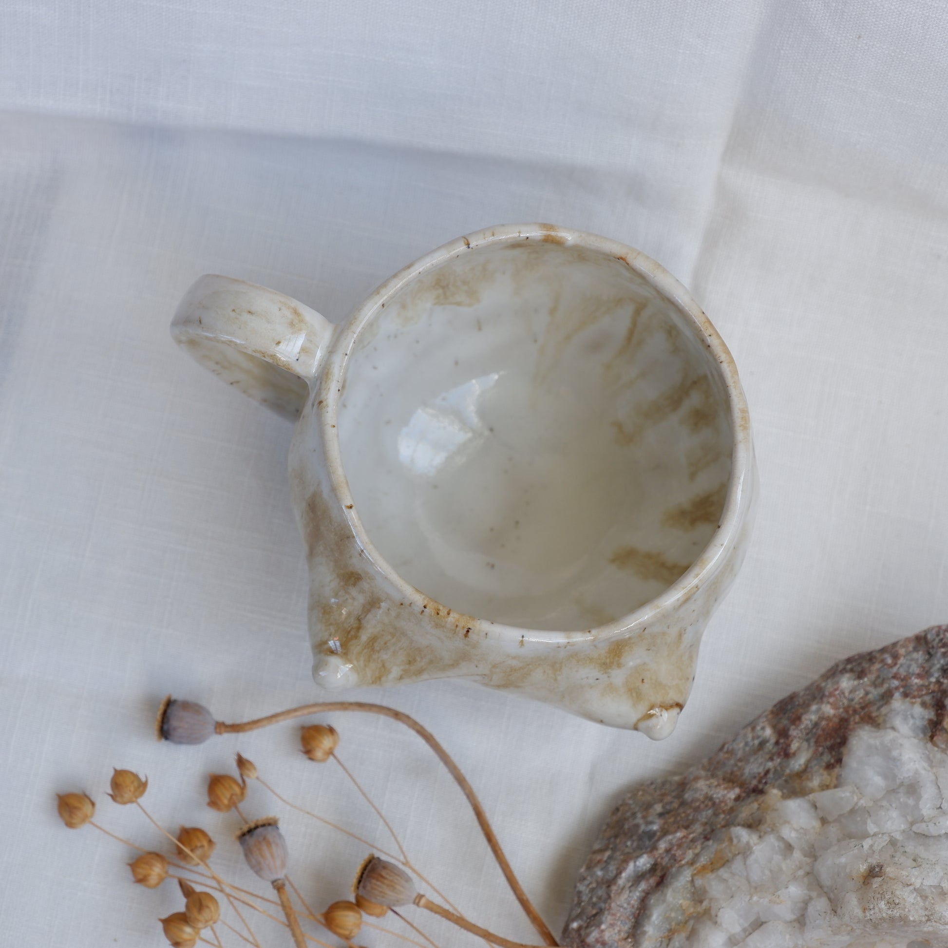 Shaped slowly by hand with the pinch technique from beige clay. The glossy glazes flow together in their own natural rhythm, giving it a character that can’t be repeated. On the unglazed bottom, you’ll find my signature as a small reminder of the hands that made it.