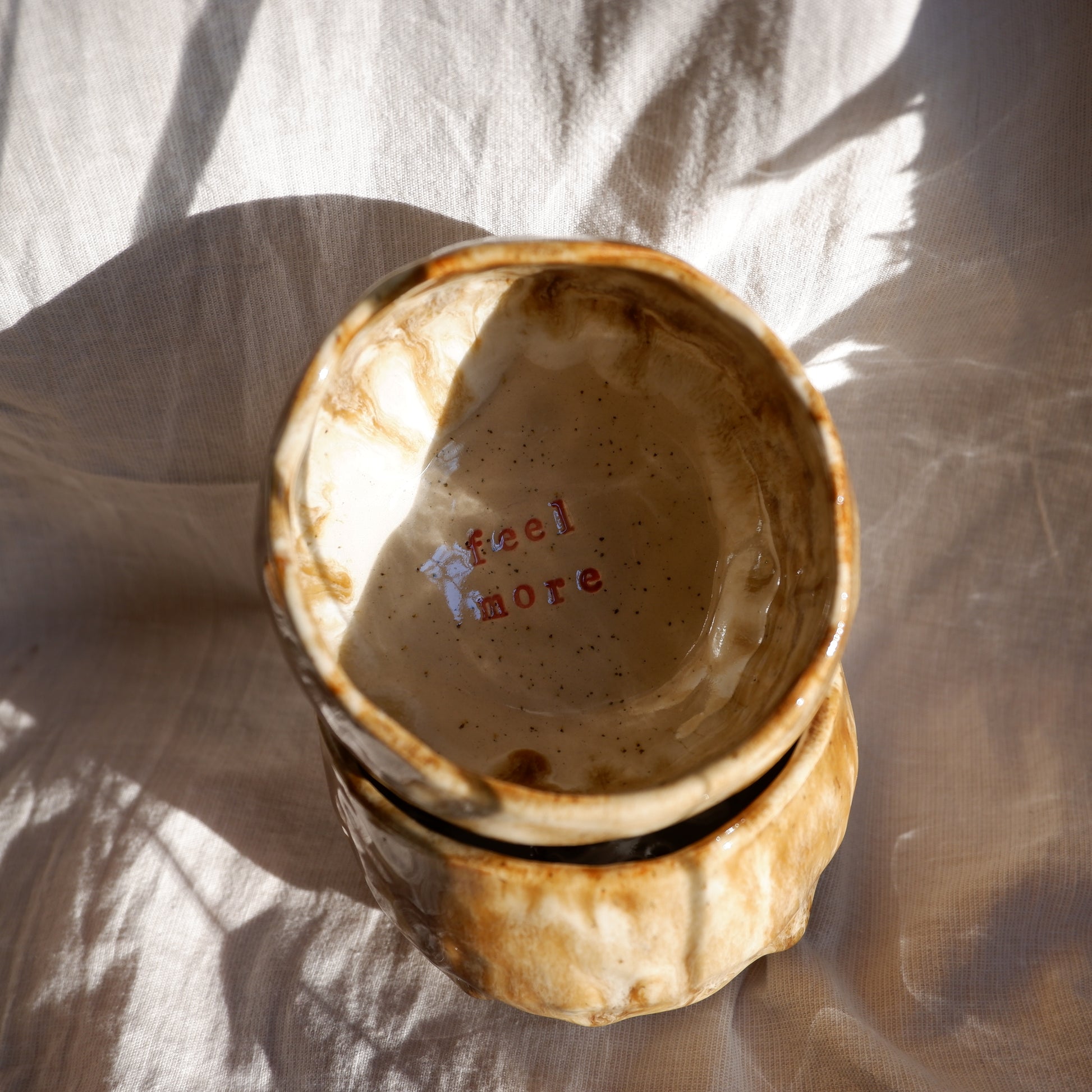 Crafted with intention, these handmade cups are designed to hold your ceremonial cacao or other daily rituals. Each cup is unique and has a hand-stamped text inside that offers a gentle reminder as you sip.