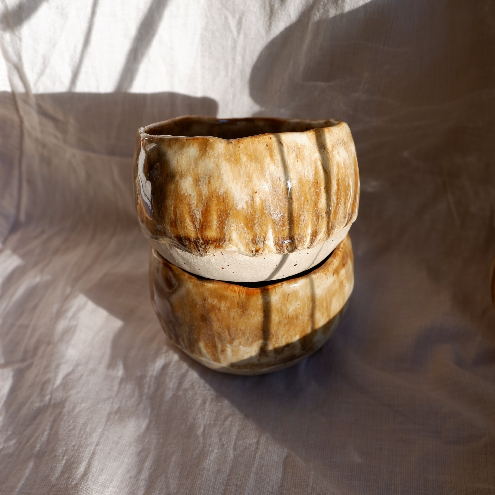 Made from speckled beige clay and finished with a combination of glossy glazes, they carry both warmth and presence in your hands. Every cup is one of a kind, yet your cup will be similar to the ones in the group photo, sharing the same grounding beauty.