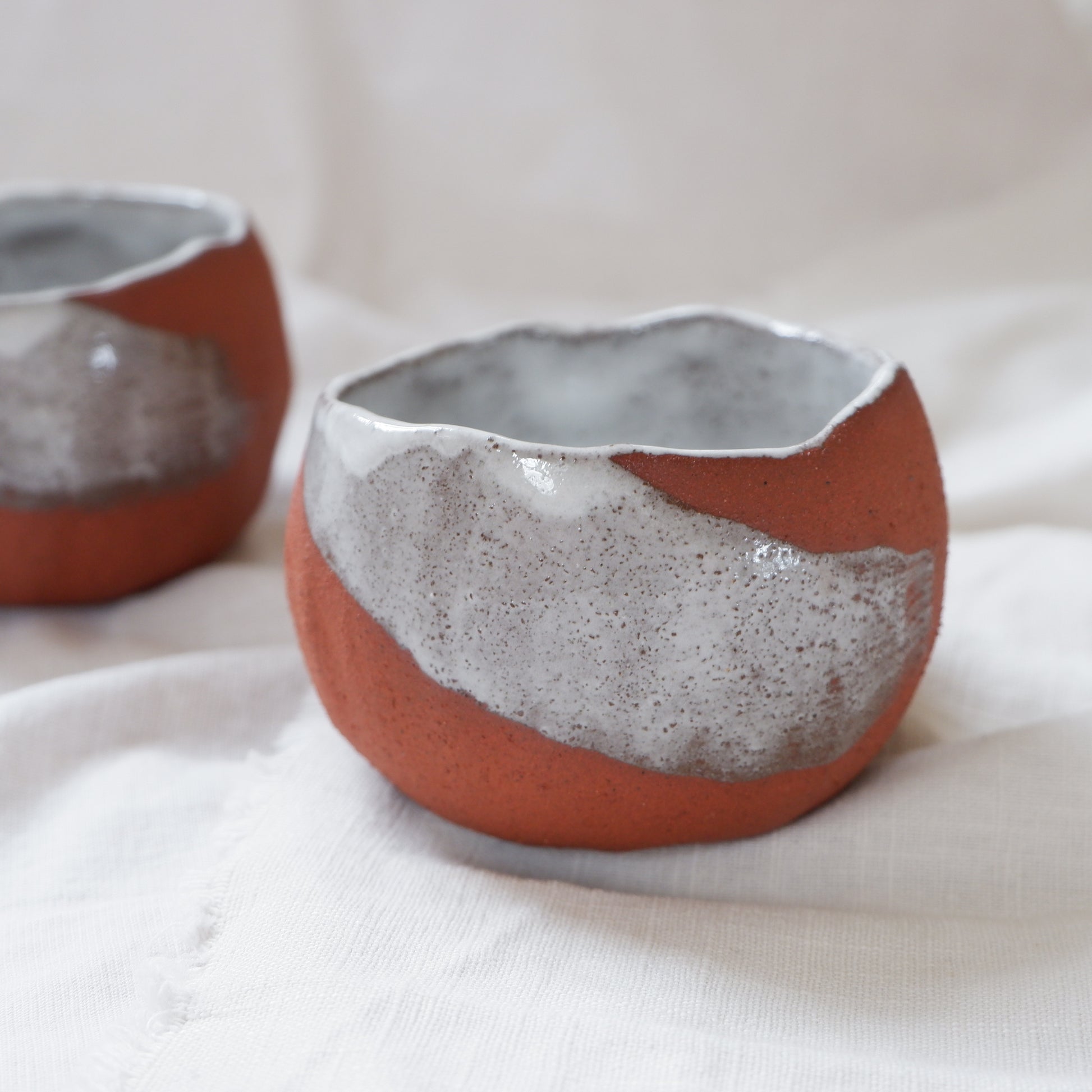 The cup is handmade with a pinch technique from brick-red clay, inside is glazed with a glossy white food safe glaze, and on the outside decorated with white brush sign. The cup has a special texture that will further awaken your senses. It has my sign at the unglazed bottom and the rim of each cup is irregularly shaped.