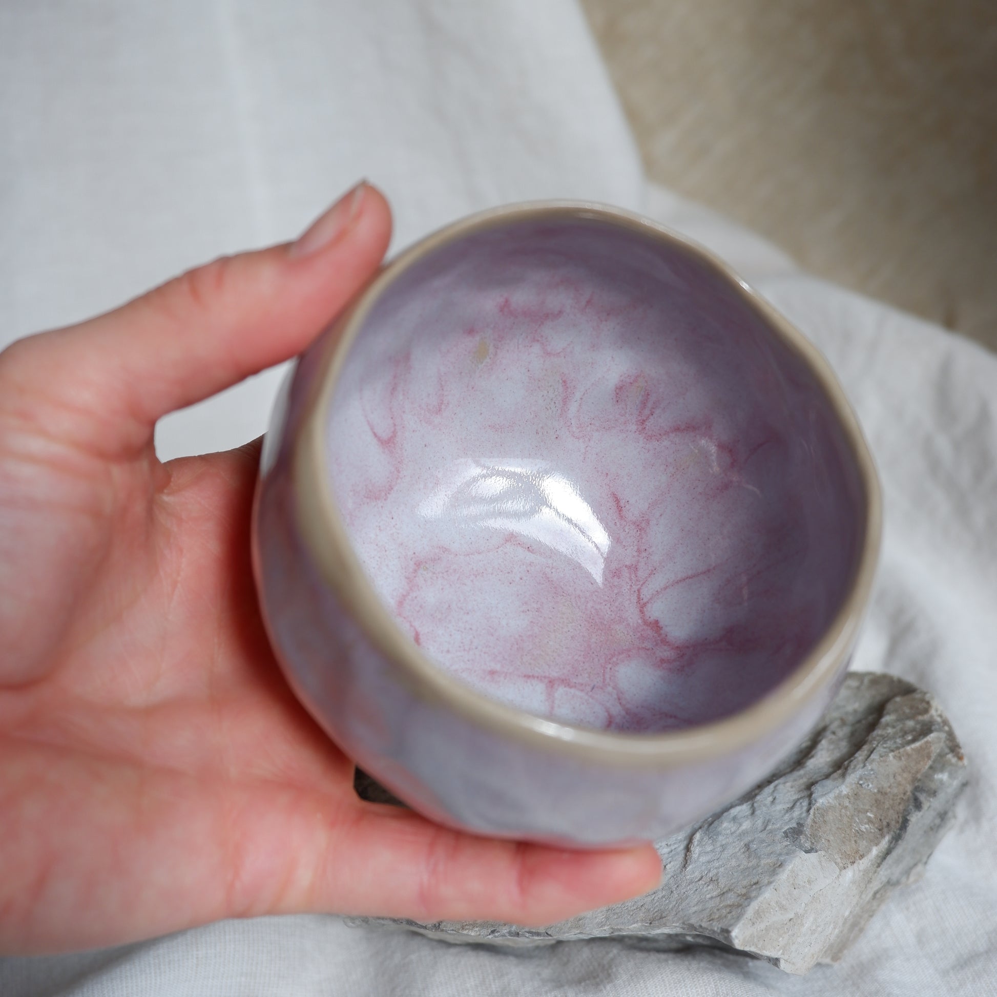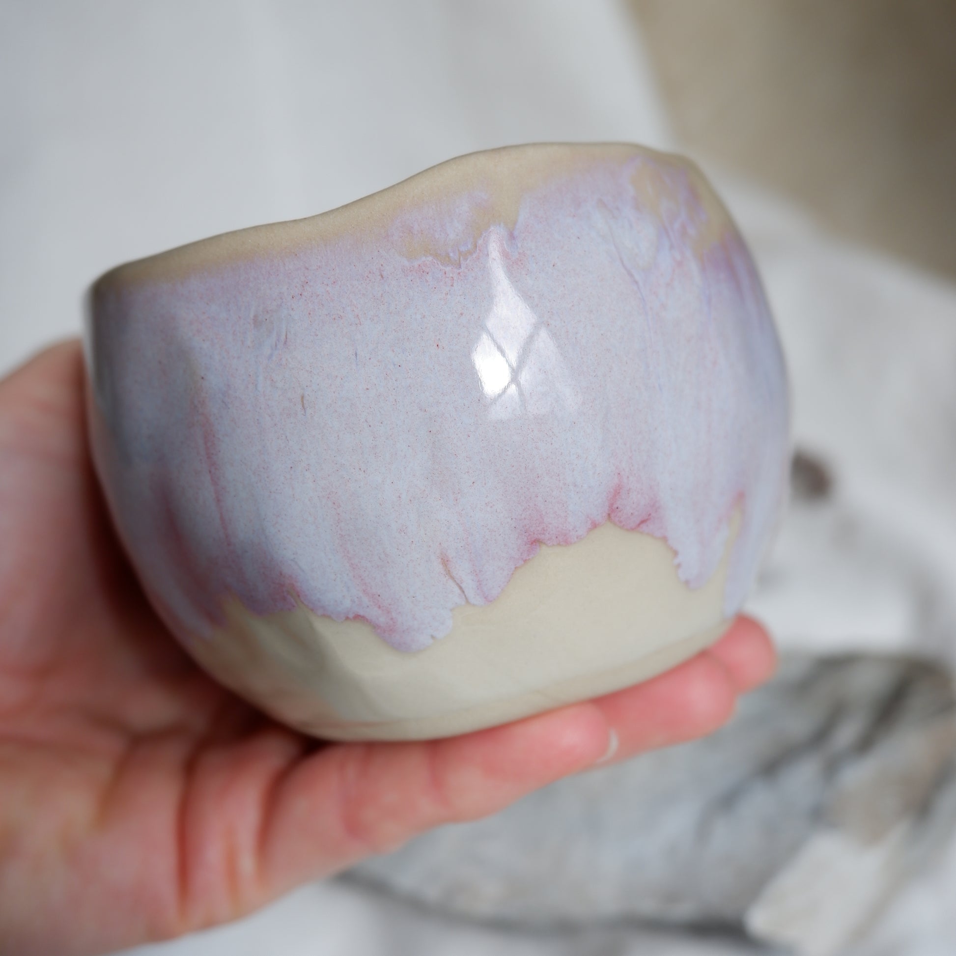 Crafted from beige clay using the pinch technique, finished with a combination of several glossy glazes and signed on the unglazed bottom. Size: approx. 275 ml up to the top