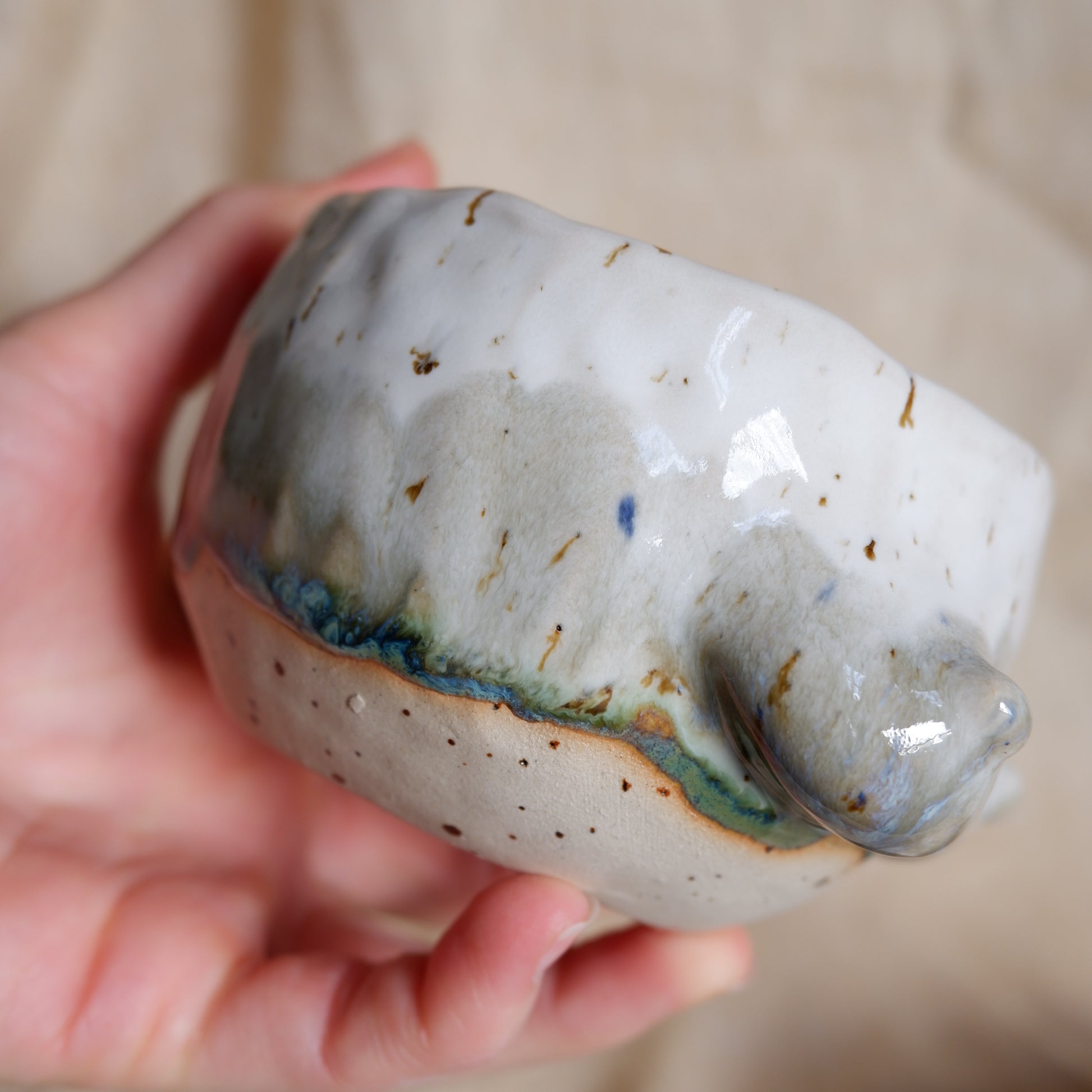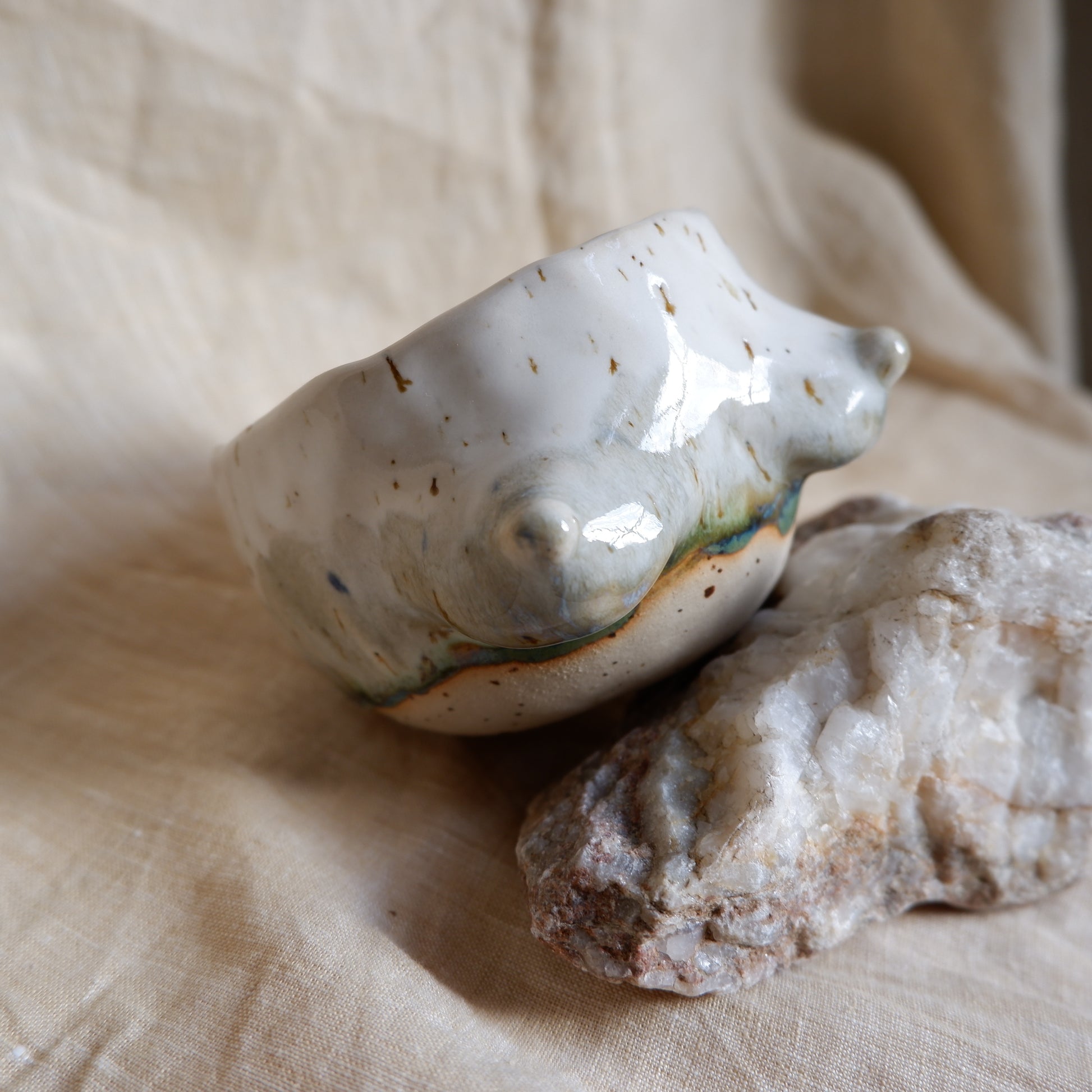 Crafted from beige clay using the pinch technique, finished with a combination of several glossy glazes and signed on the unglazed bottom.