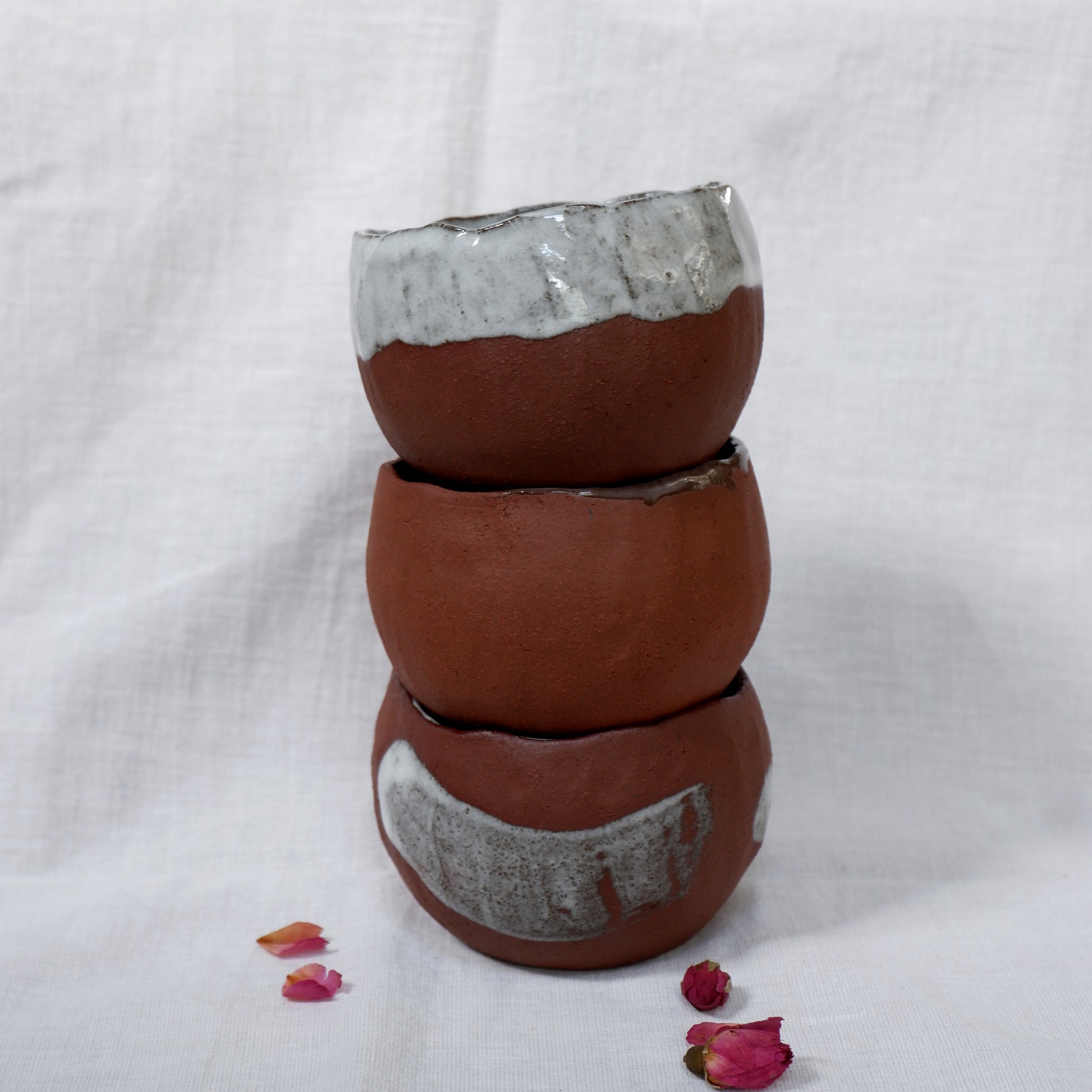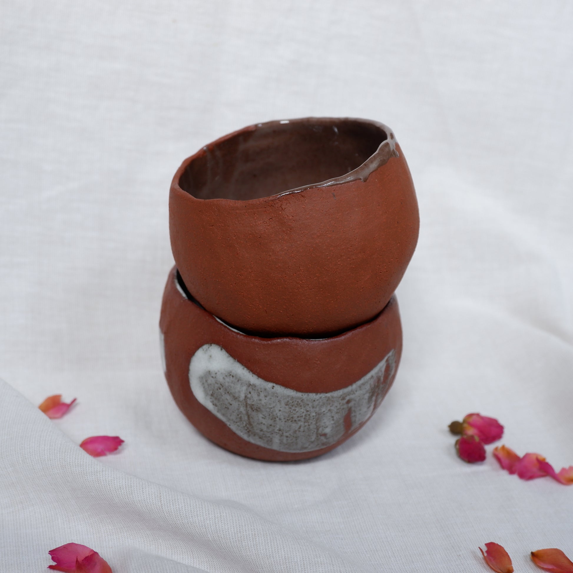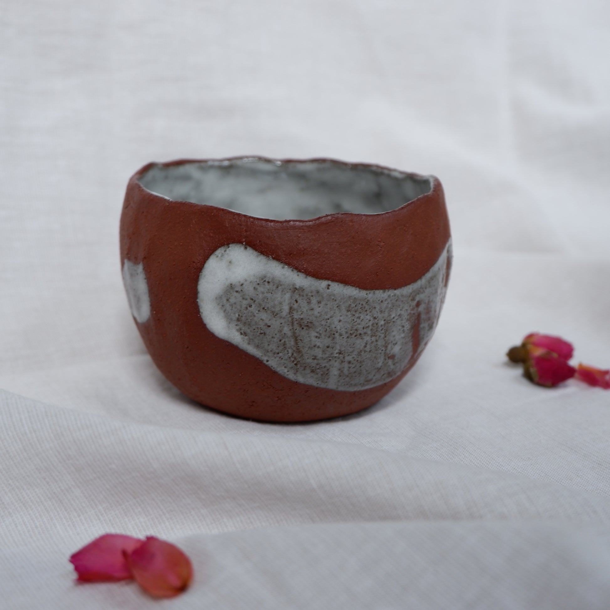 Crafted from dark red clay using the pinch technique, decorated by hand and finished with a combination of glazed and unglazed surfaces, signed on the bottom.