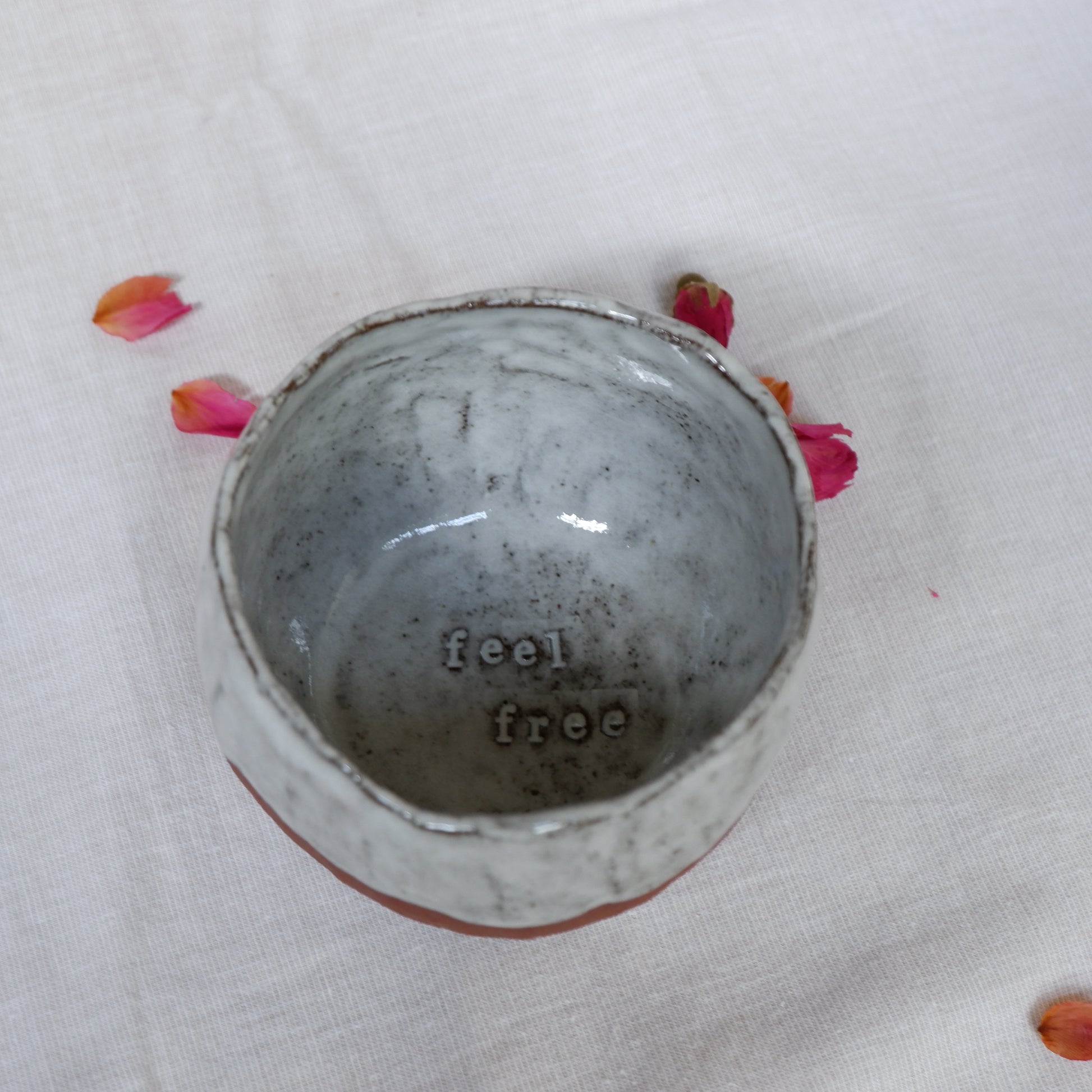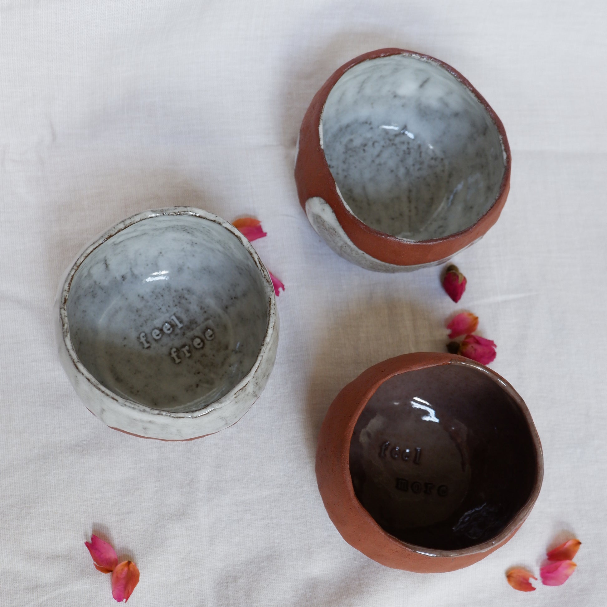 Crafted from dark red clay using the pinch technique, the mug carries a small hand-stamped reminder, gently grounding you, encouraging presence, or inviting a slower breath. It’s decorated by hand and finished with a combination of glazed and unglazed surfaces, signed on the bottom.