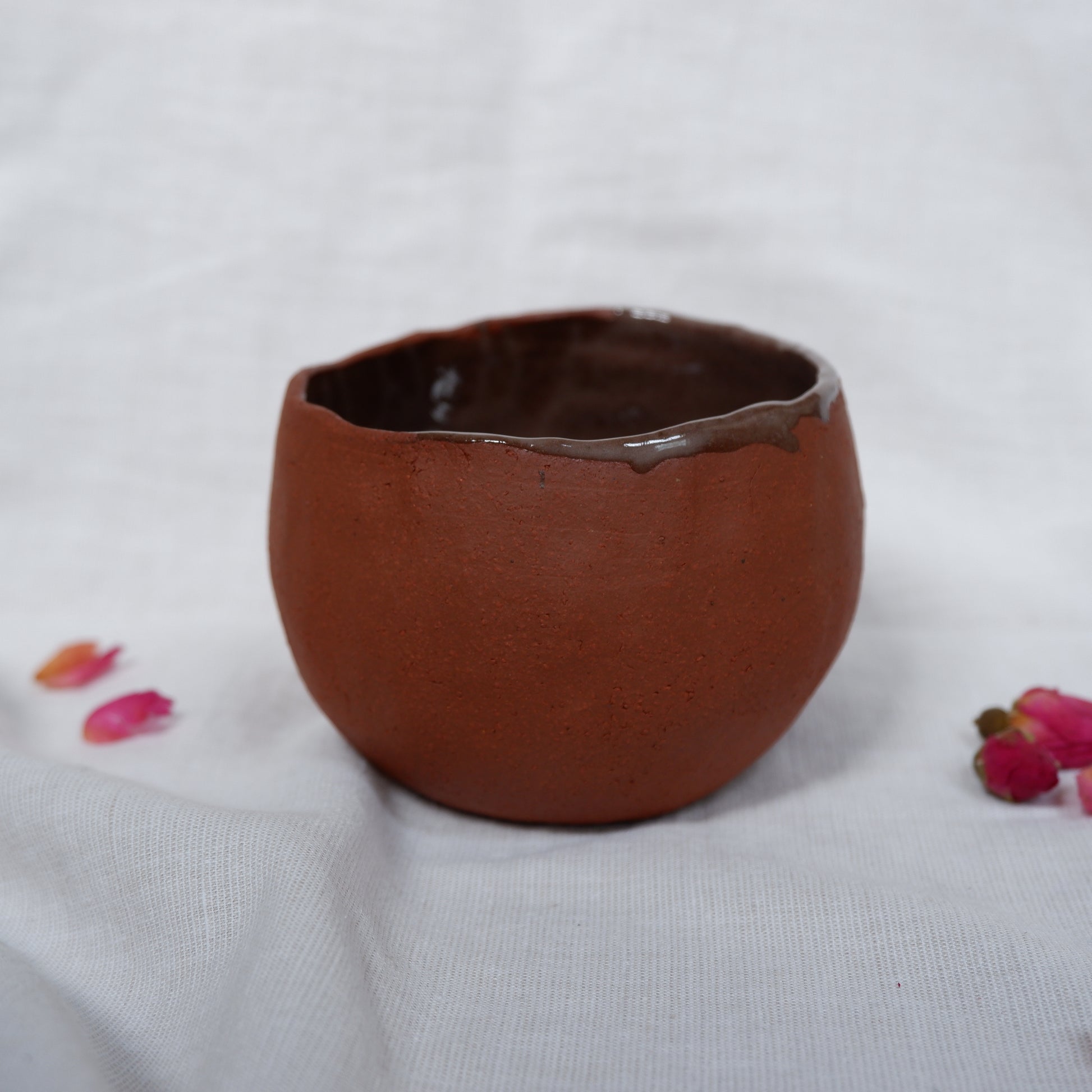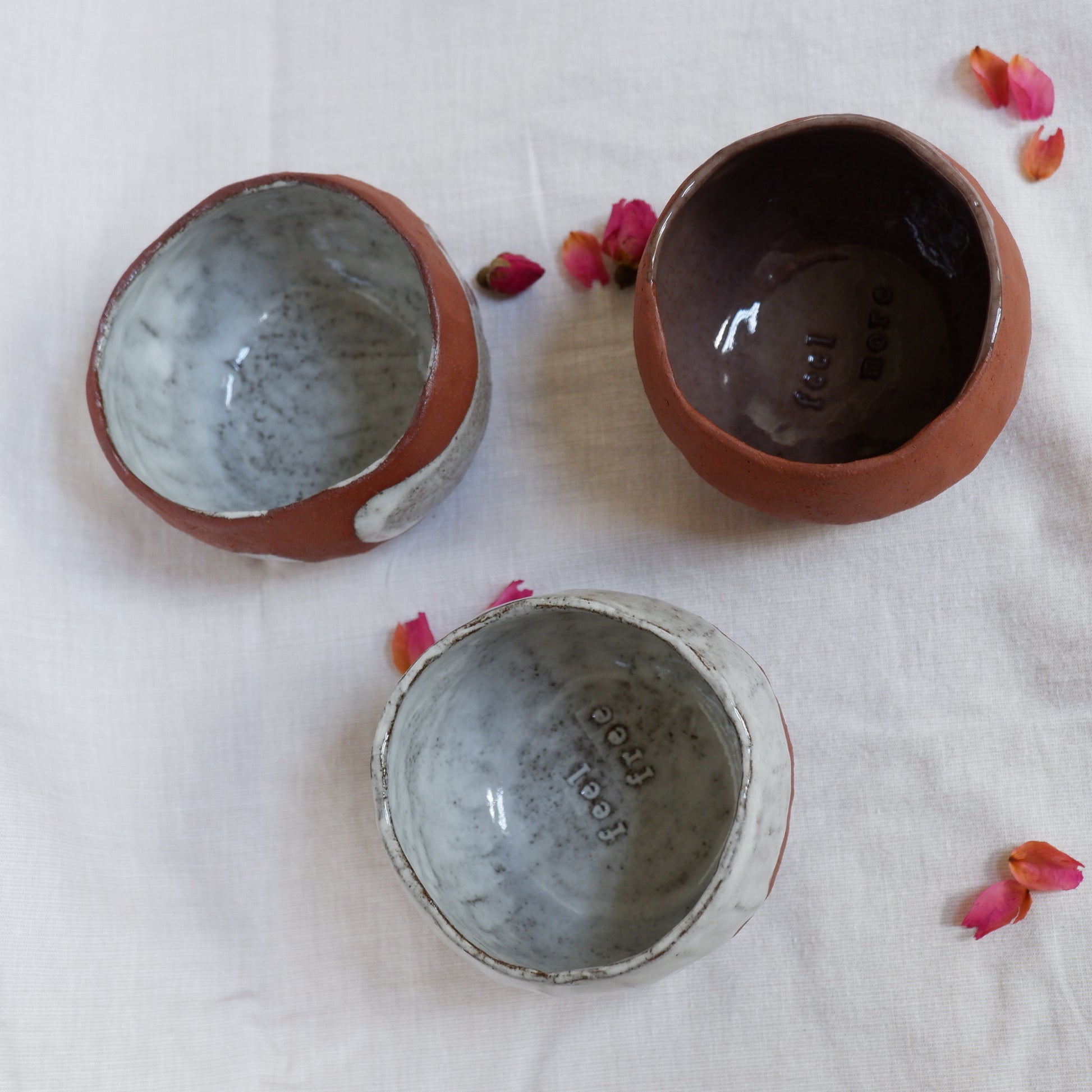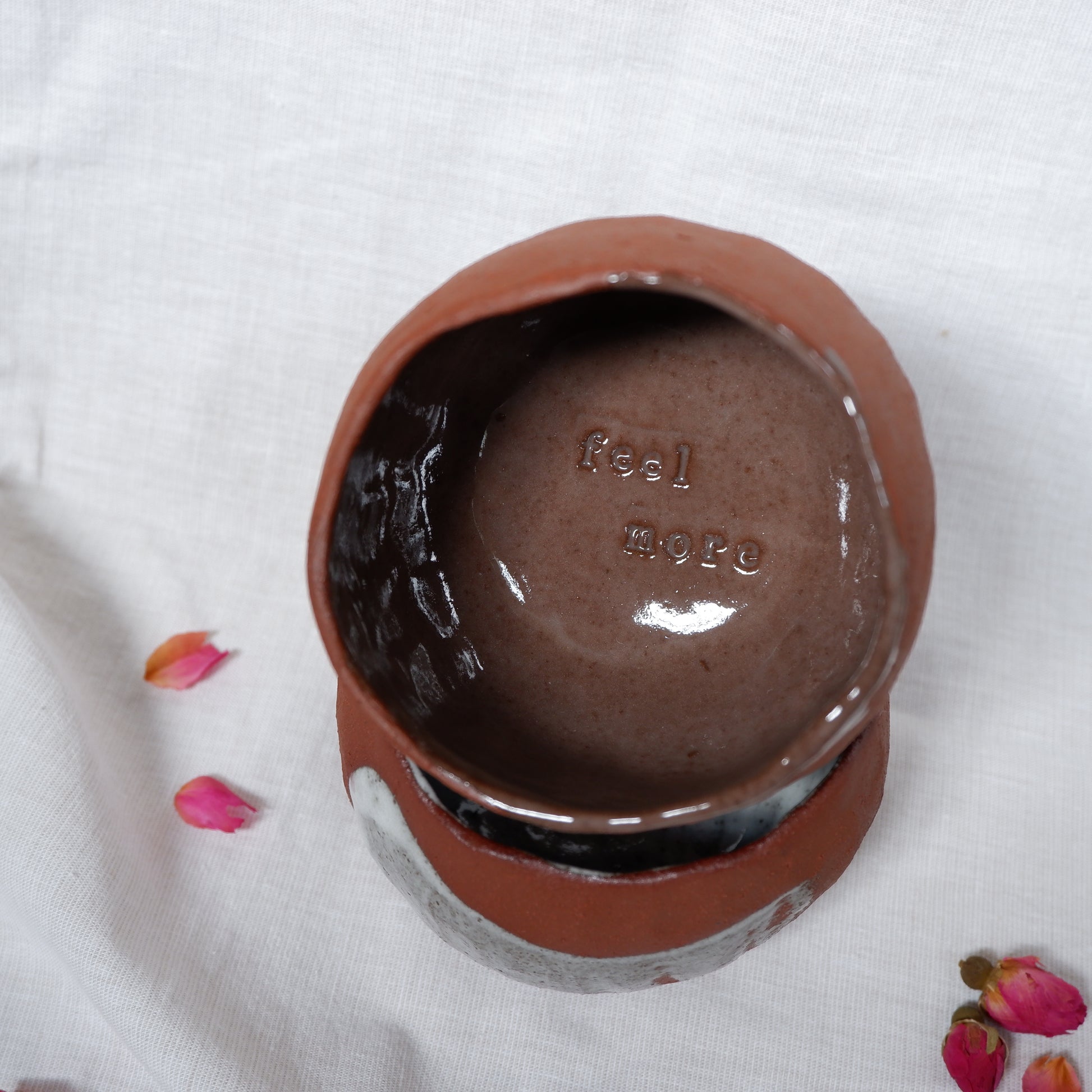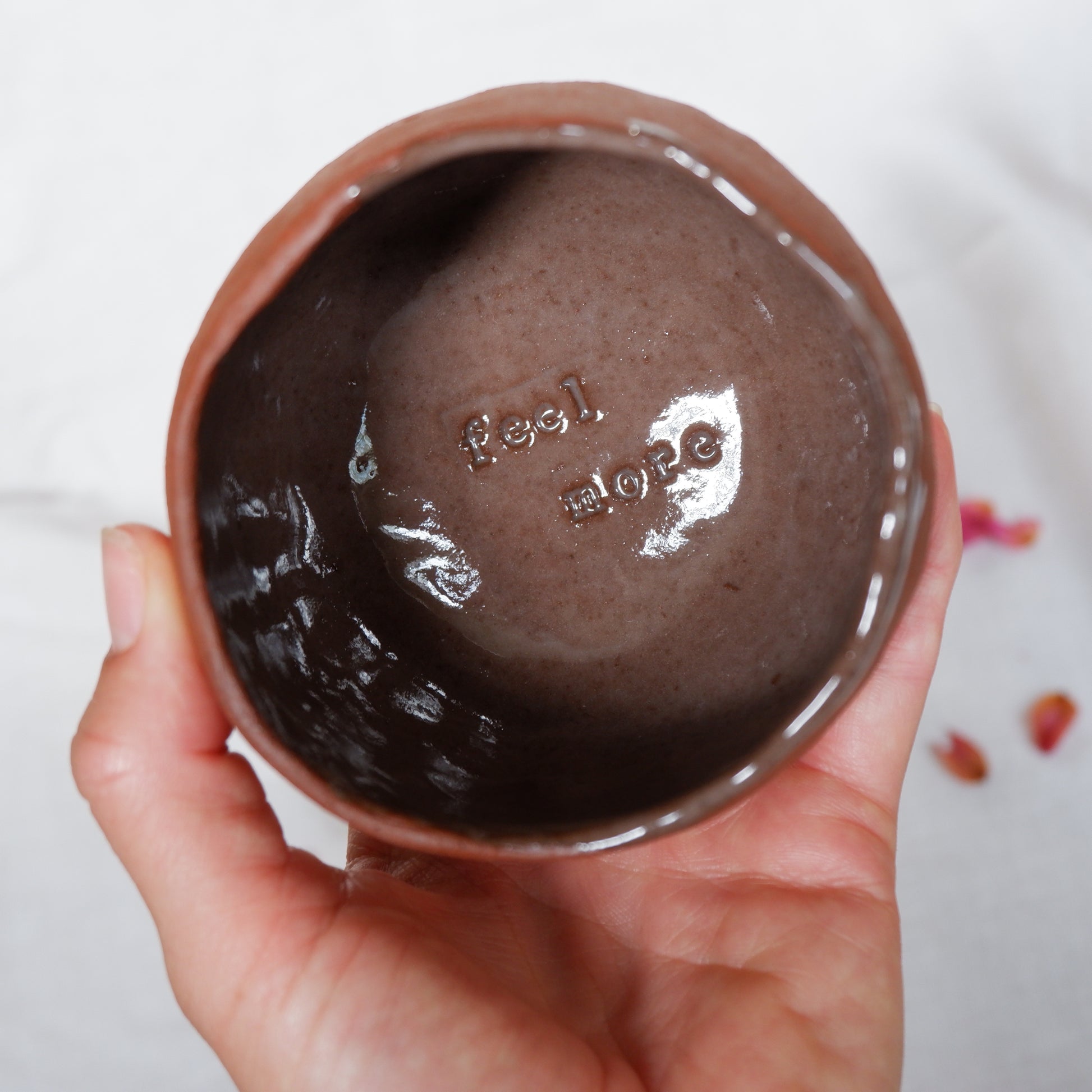 Crafted from dark red clay using the pinch technique, the mug carries a small hand-stamped reminder, gently grounding you, encouraging presence, or inviting a slower breath. It’s decorated by hand and finished with a combination of glazed and unglazed surfaces, signed on the bottom.