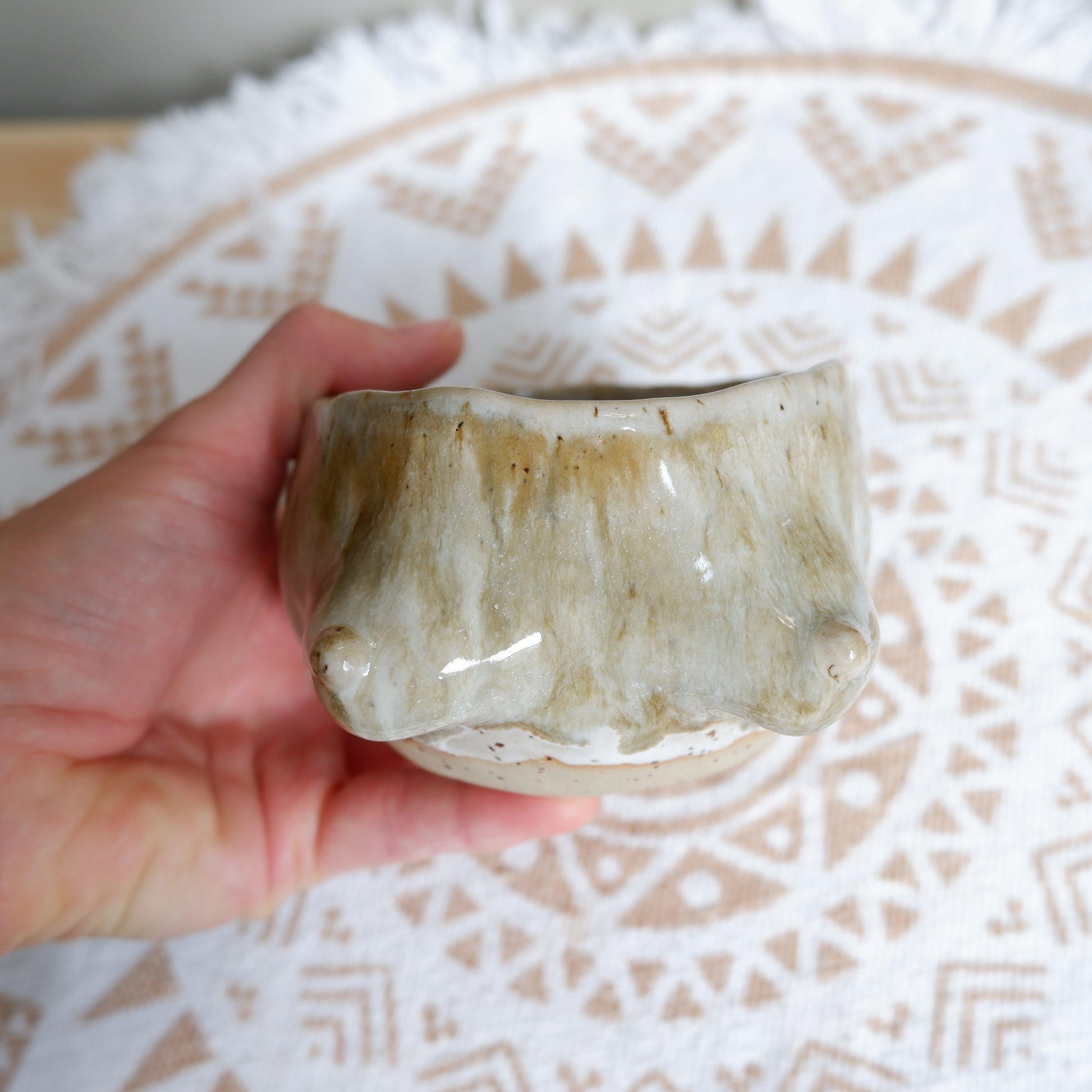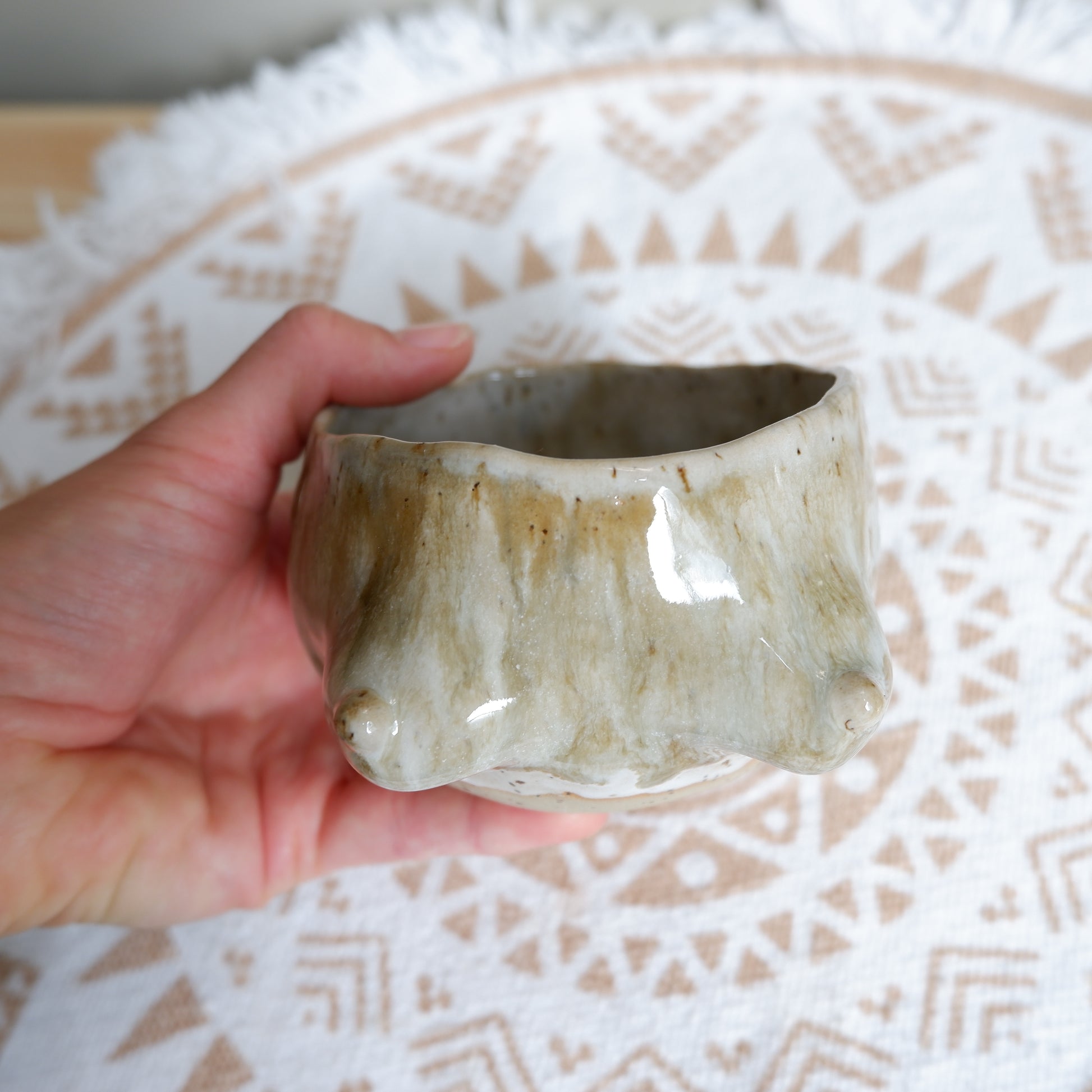 The mug is crafted from beige clay using the pinch technique. It's finished with a combination of glossy glazes and signed on the unglazed bottom.