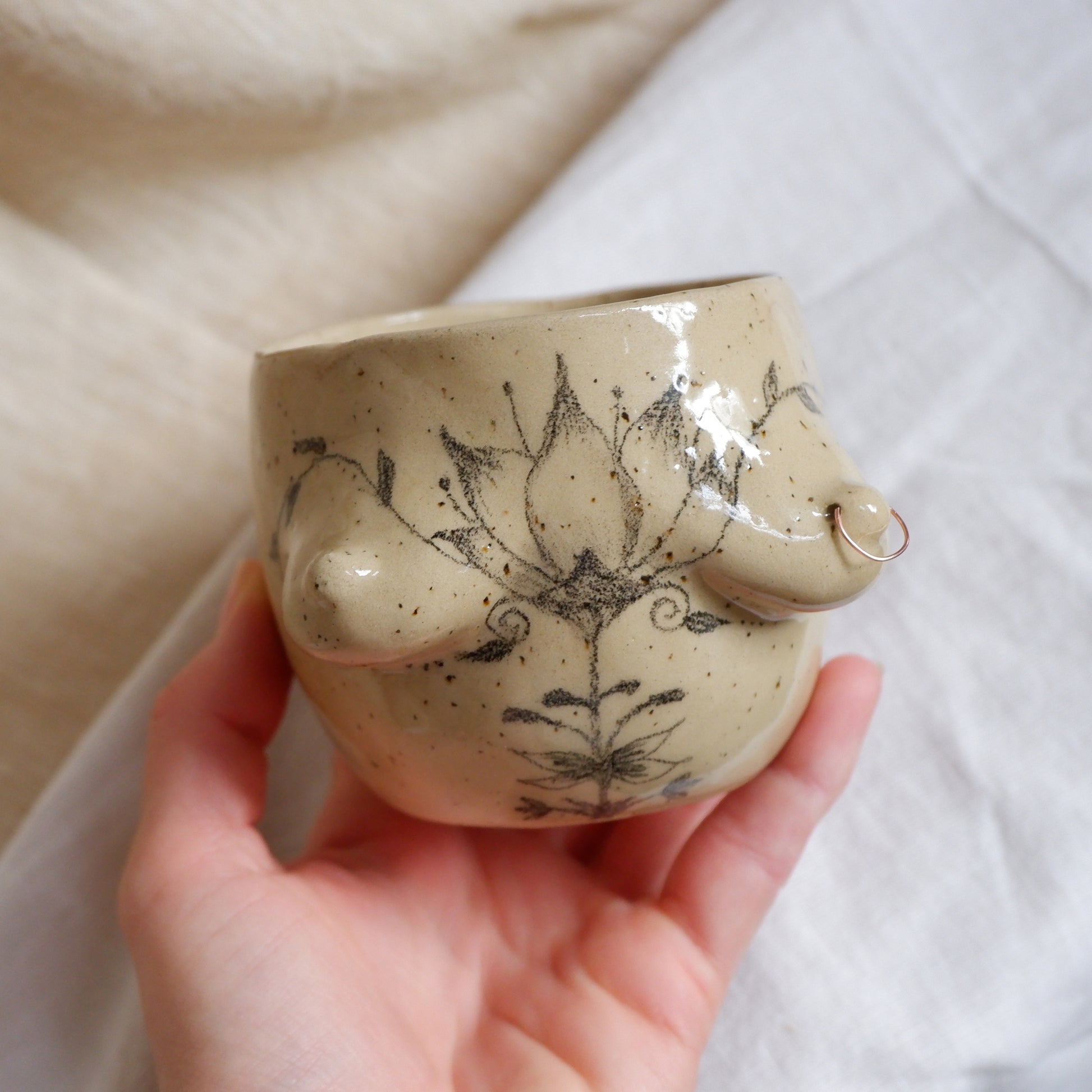 Crafted from beige clay using the pinch technique, tattoo is entirely hand-drawn, no prints or stamps, making every mug one-of-a-kind. Finished with a glossy clear glaze and signed on the unglazed bottom, this mug brings art and functionality together in a truly personal way.