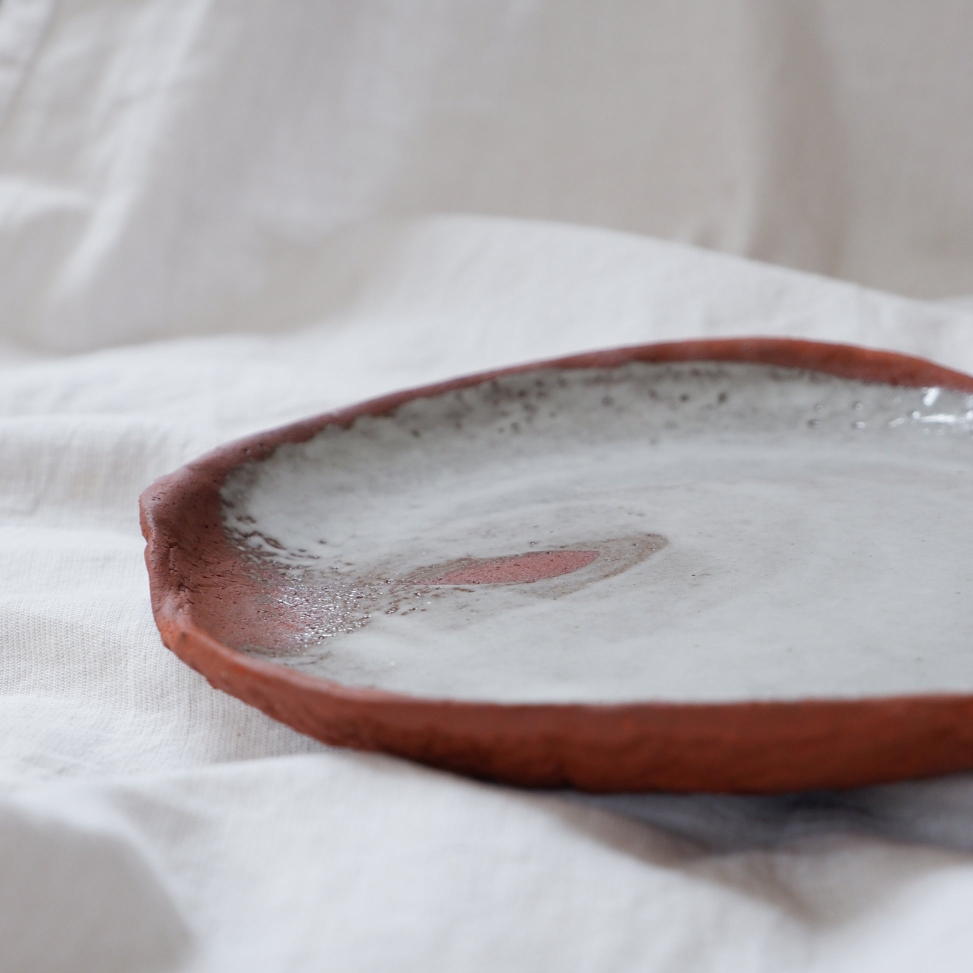 The plate is handmade with a slab building technique from red clay and finished with a glossy white glaze. The bottom is unglazed and specially hand-decorated to have a moon-like surface. My sign is stamped on the bottom of each plate.