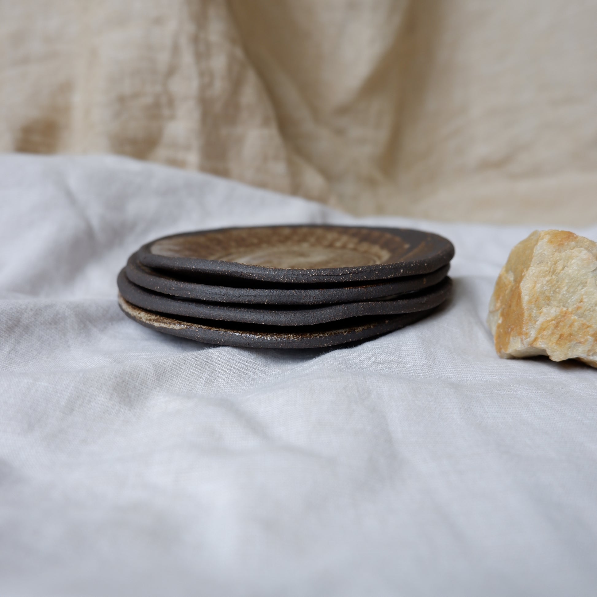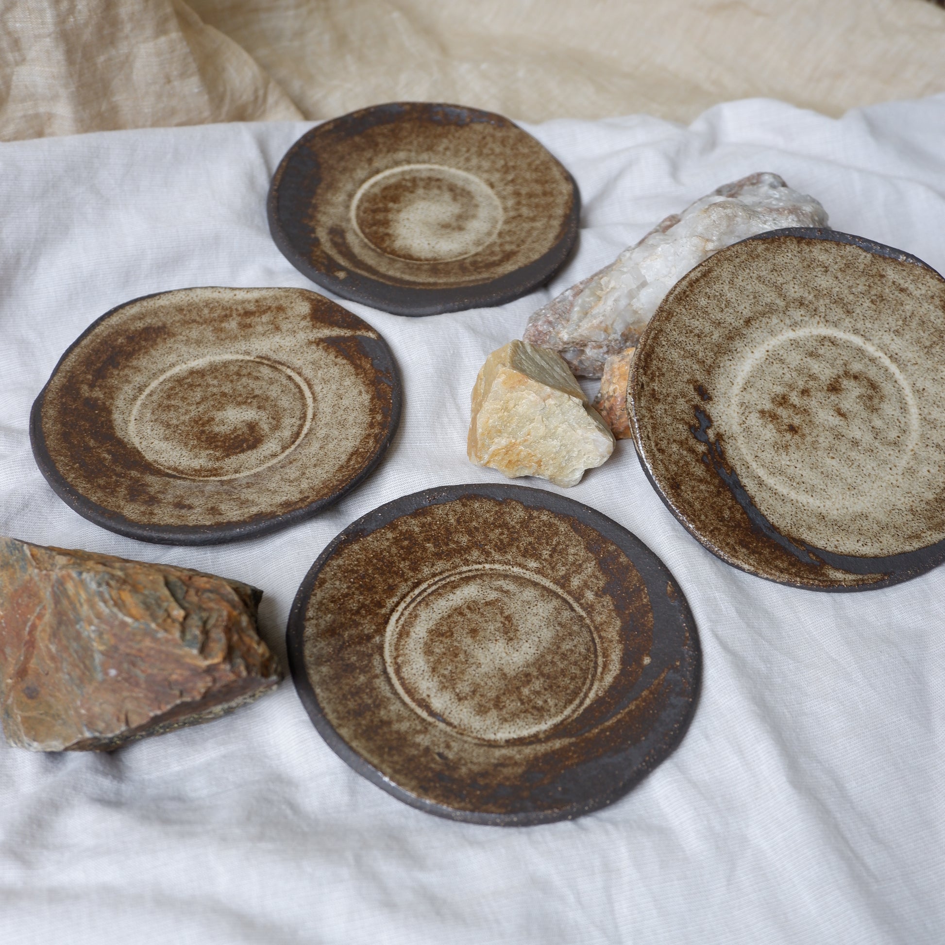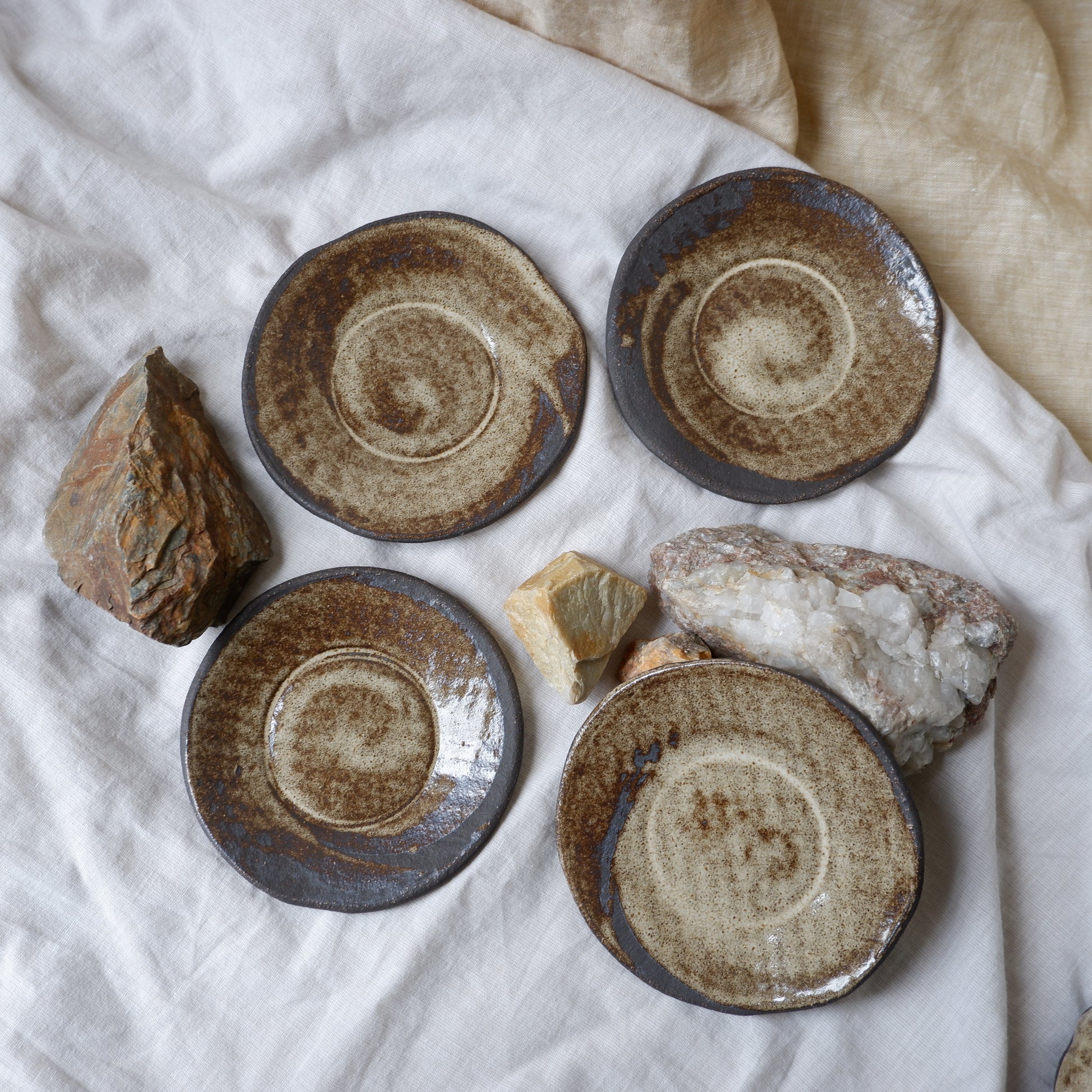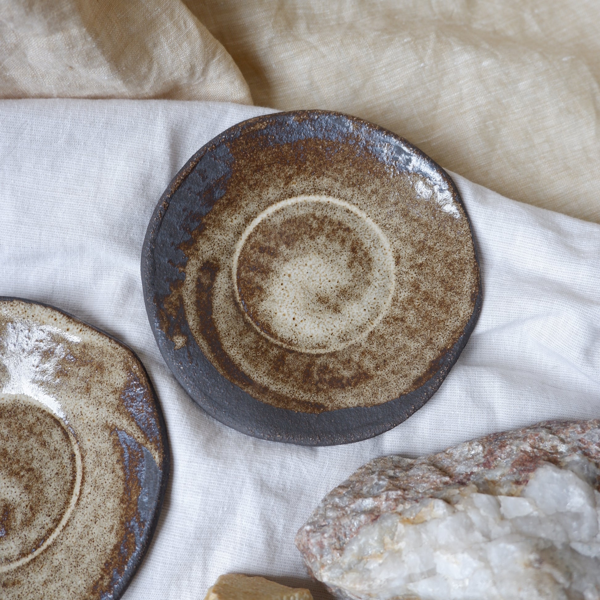 Handmade using the slab building technique from rich brown clay, these saucers bring warmth and earthiness to your special moments. Each saucer is glazed by hand and unique.