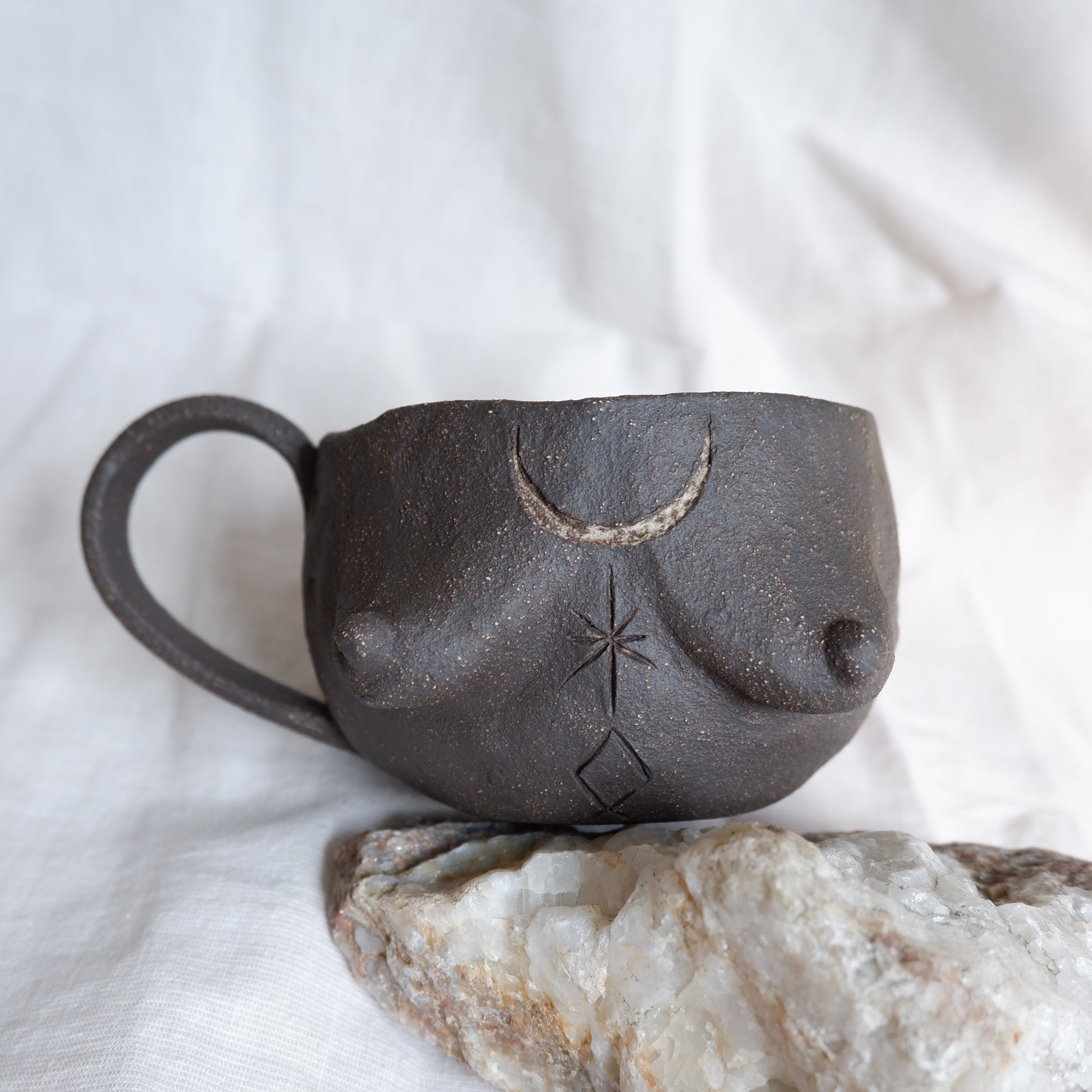 This mug is made from rich brown clay, it's wild, powerful, and a little bit magical, hand-carved with the moon, star and Othala rune. This mug symbolizes belonging and protection, with the moon and star watching over, and Othala rooting you in ancestral wisdom.
