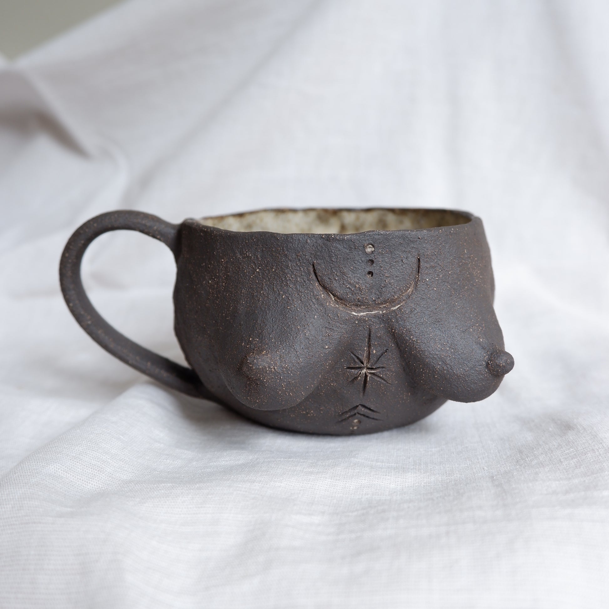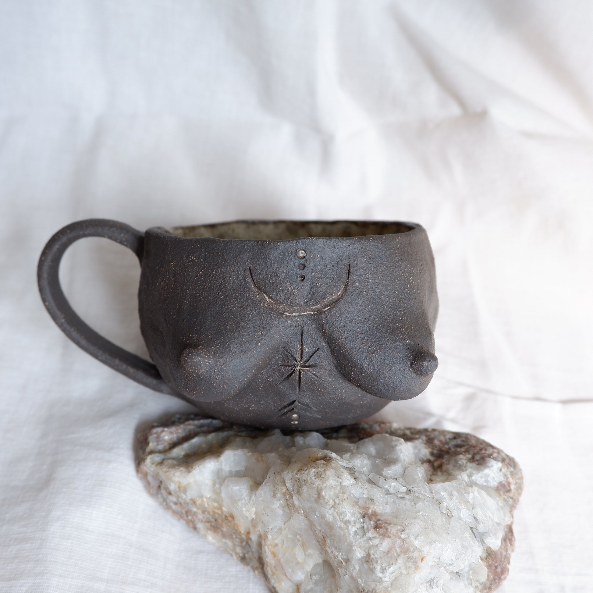 This mug is made from rich brown clay, it's wild, powerful, and a little bit magical, hand-carved with the moon, star and Kenaz rune. This mug symbolizes growth and illumination, with the moon and star shining above, Kenaz kindling the fire of change, and dots weaving the rhythm of expansion.