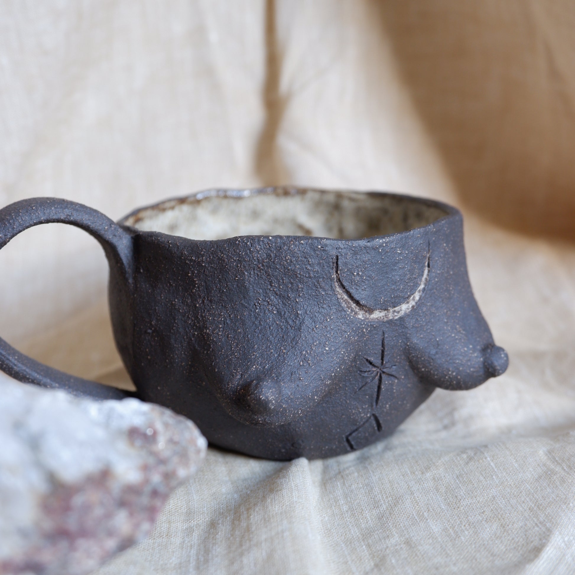 This mug is made from rich brown clay, it's wild, powerful, and a little bit magical, hand-carved with the moon, star and Kenaz rune. This mug symbolizes guidance and transformation, with the moon and star as celestial protectors, Kenaz sparking the inner flame, and three dots marking the path ahead.