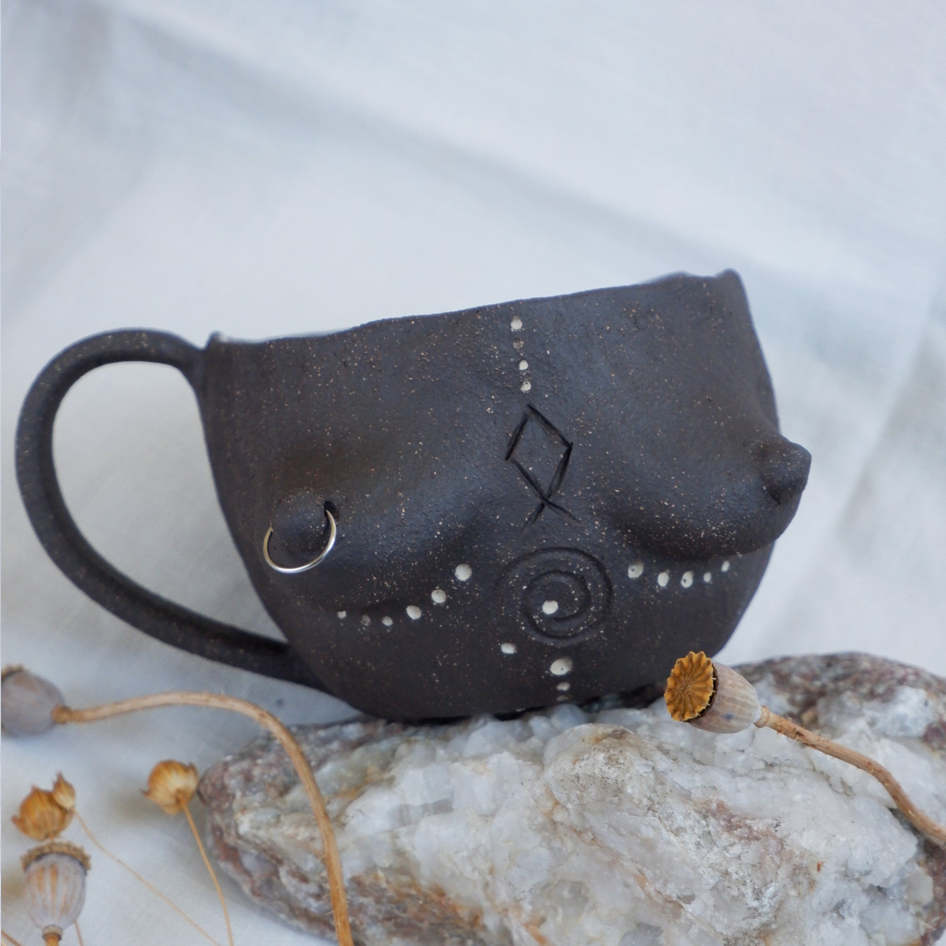 This mug is made from rich brown clay, it's wild, powerful, and a little bit magical. Hand-carved with Othala and a spiral, it symbolizes heritage, growth, and connection. Othala honors ancestry and home, the spiral evokes evolution and cycles, and the dots map the steps along your path.