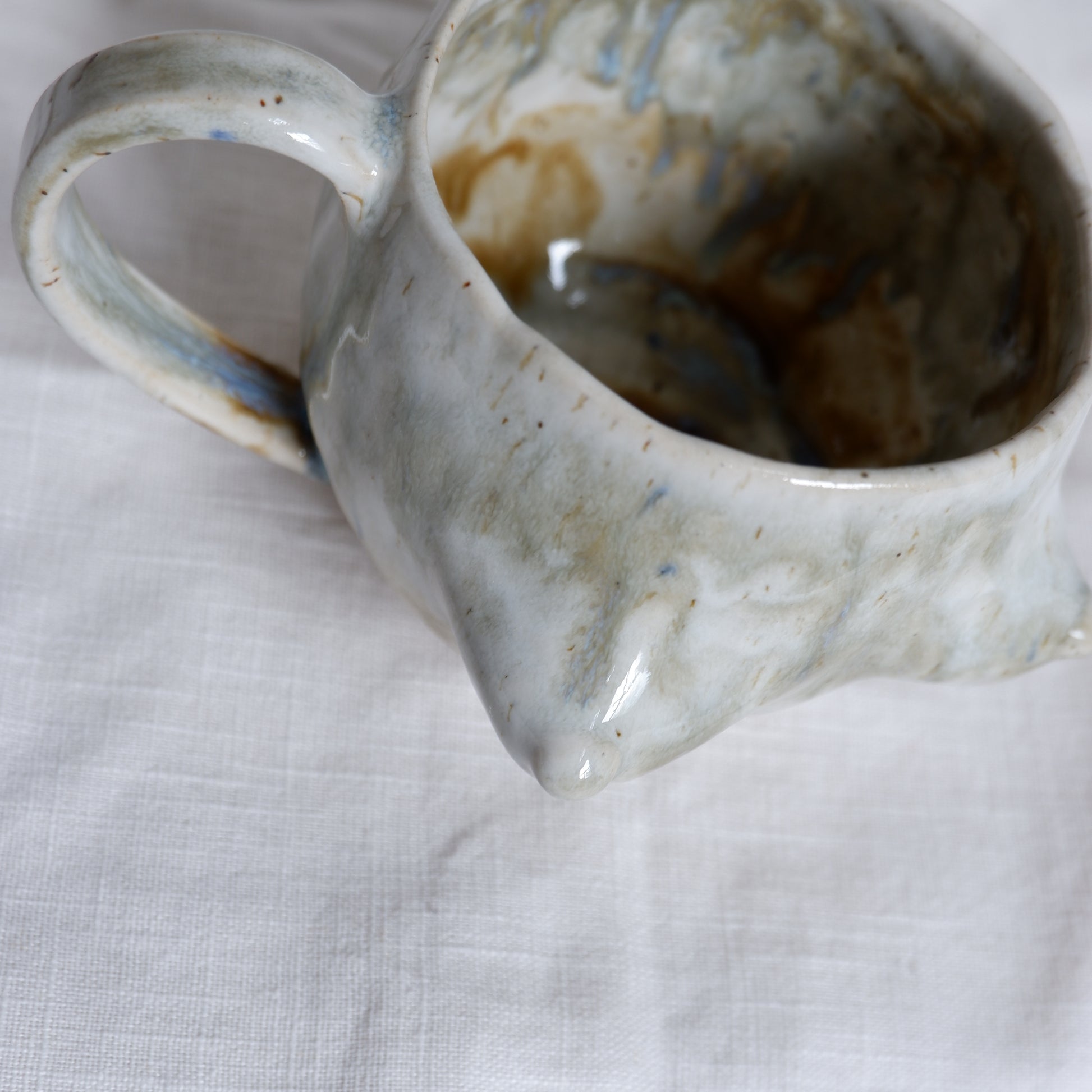 Shaped slowly by hand with the pinch technique from beige clay. The glossy glazes flow together in their own natural rhythm, giving it a character that can’t be repeated. On the unglazed bottom, you’ll find my signature as a small reminder of the hands that made it.