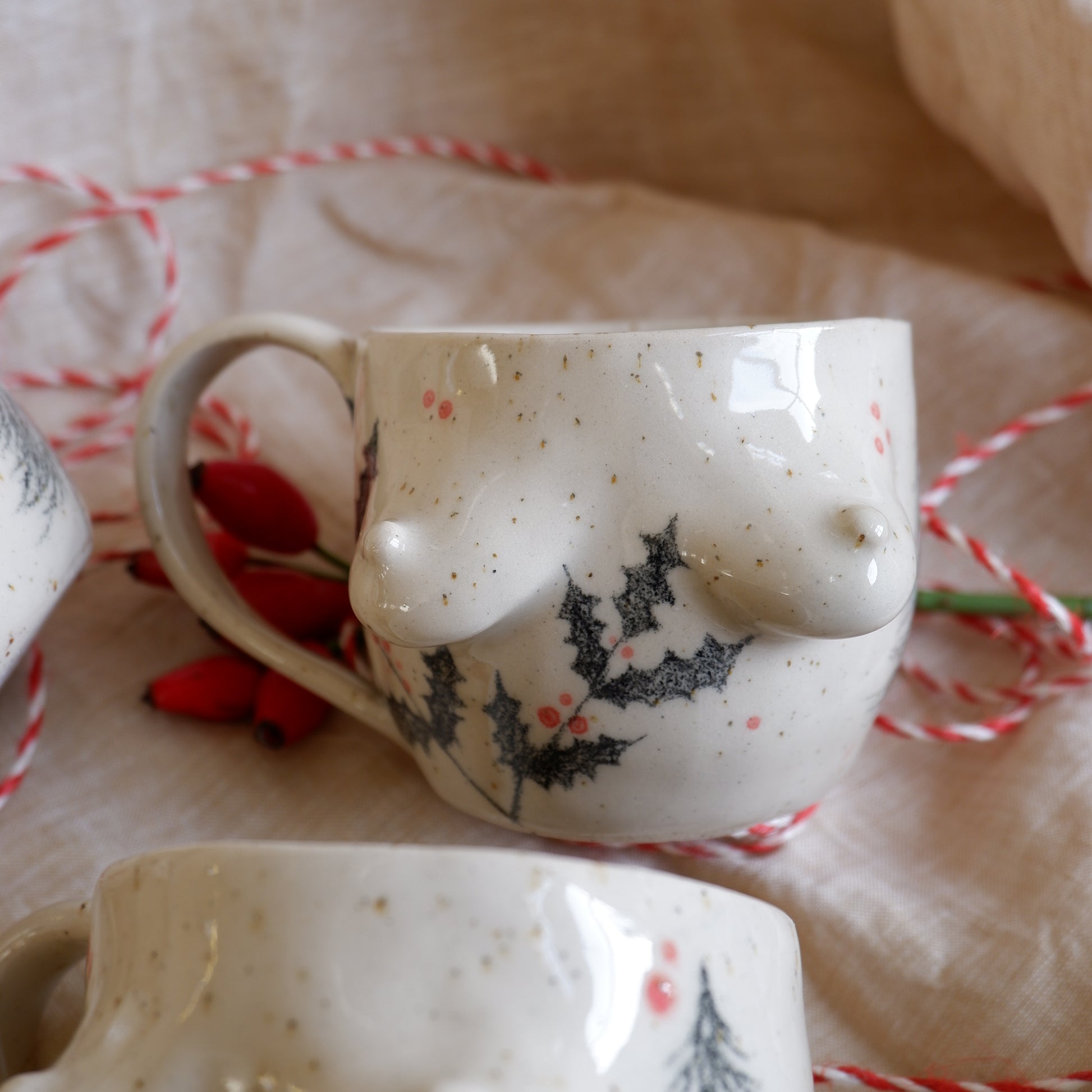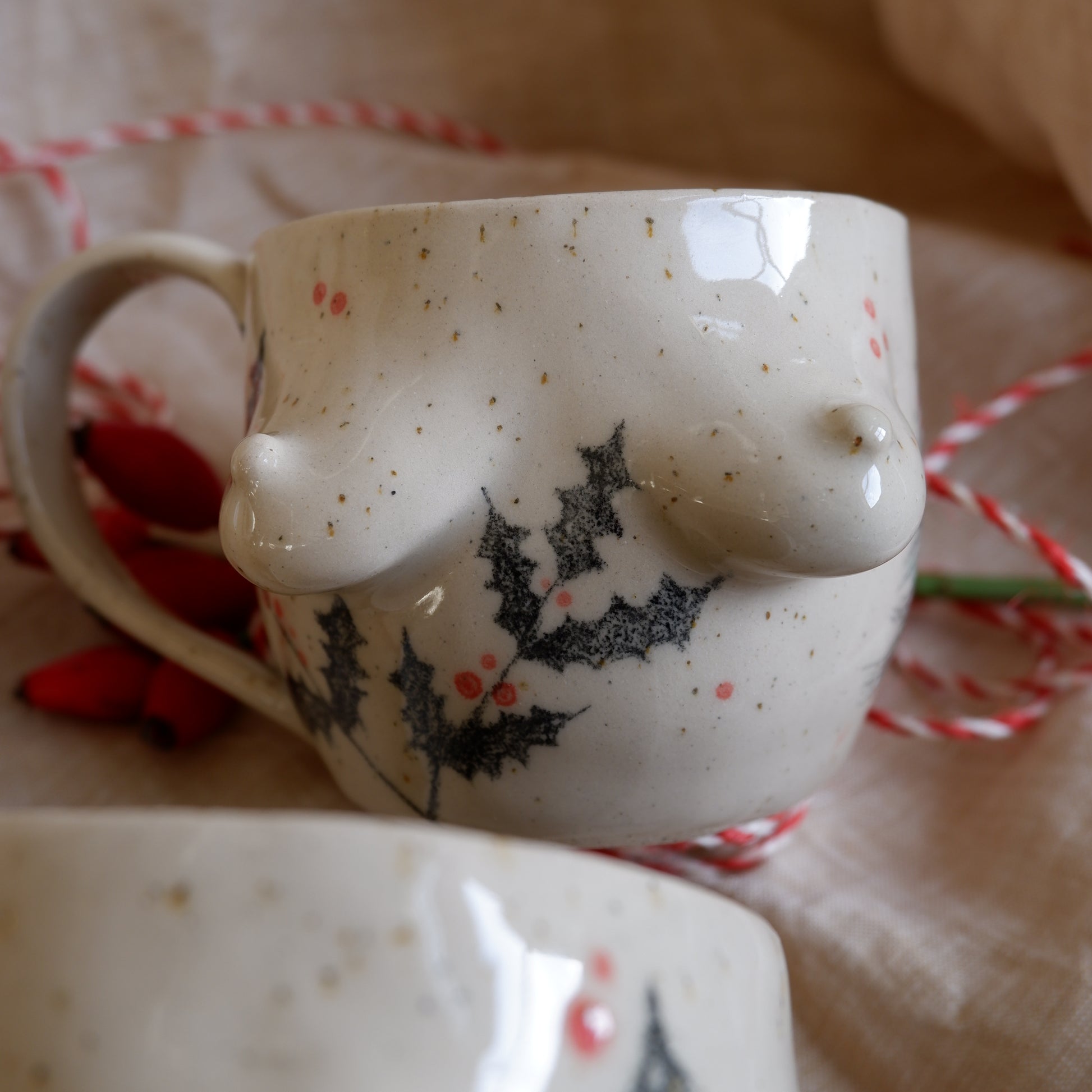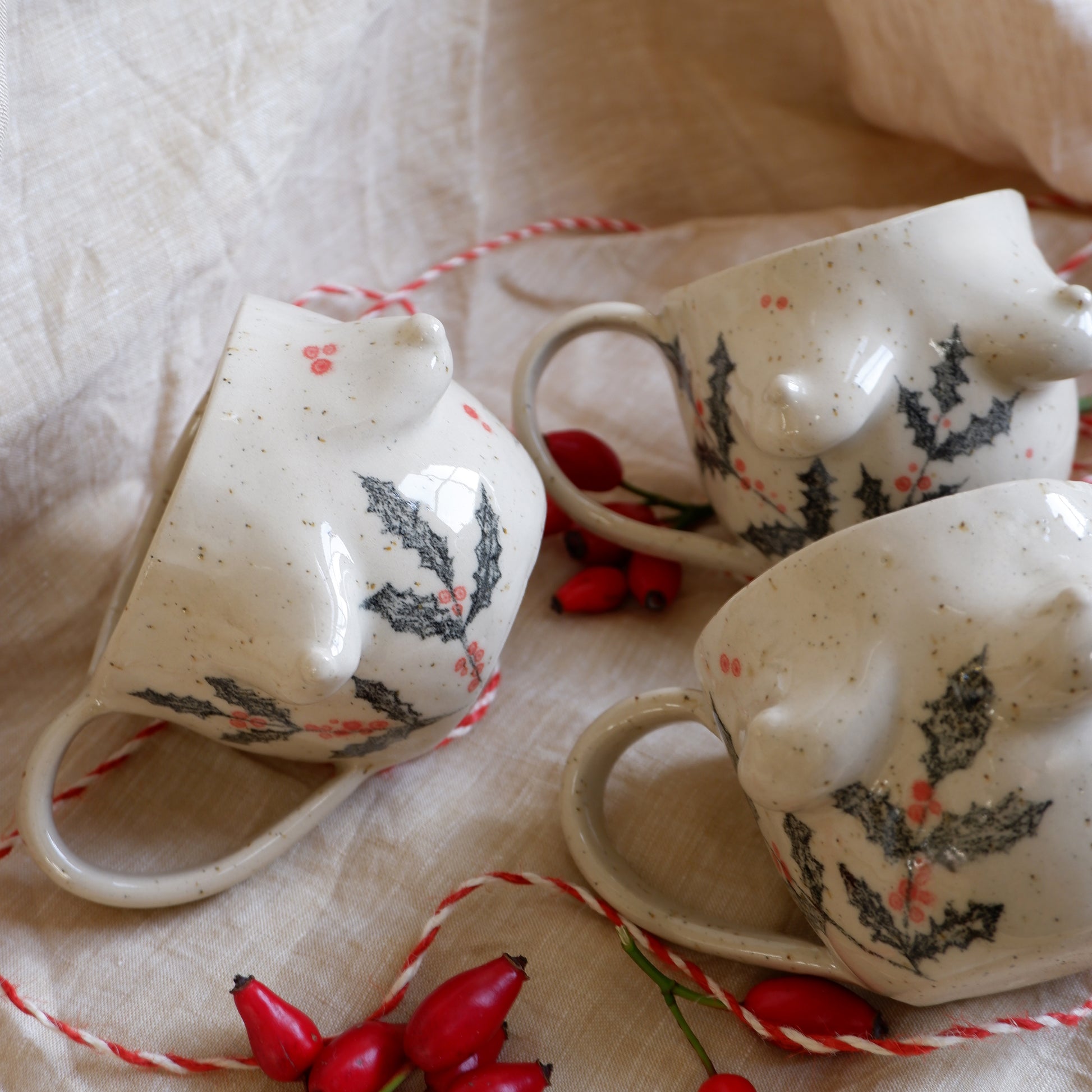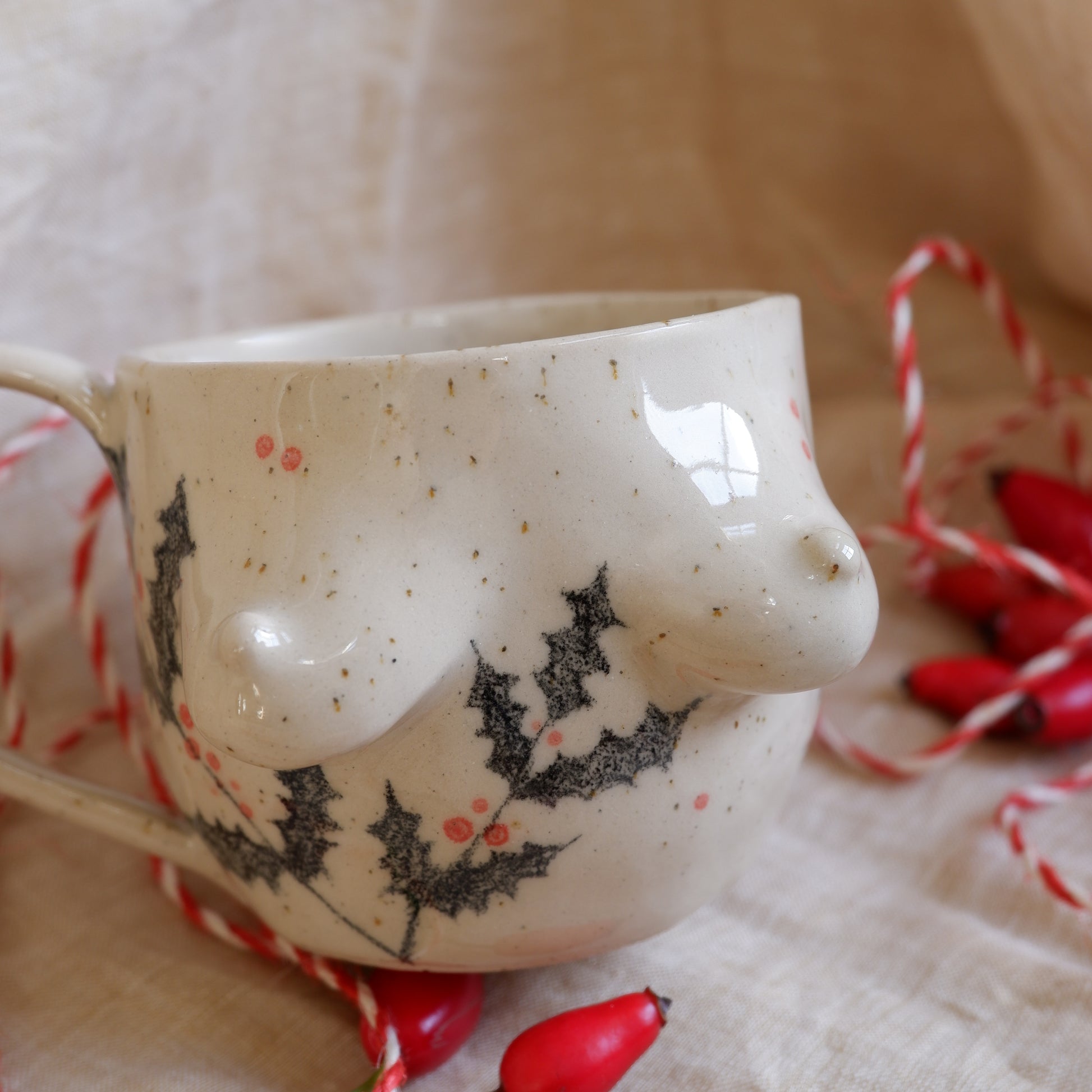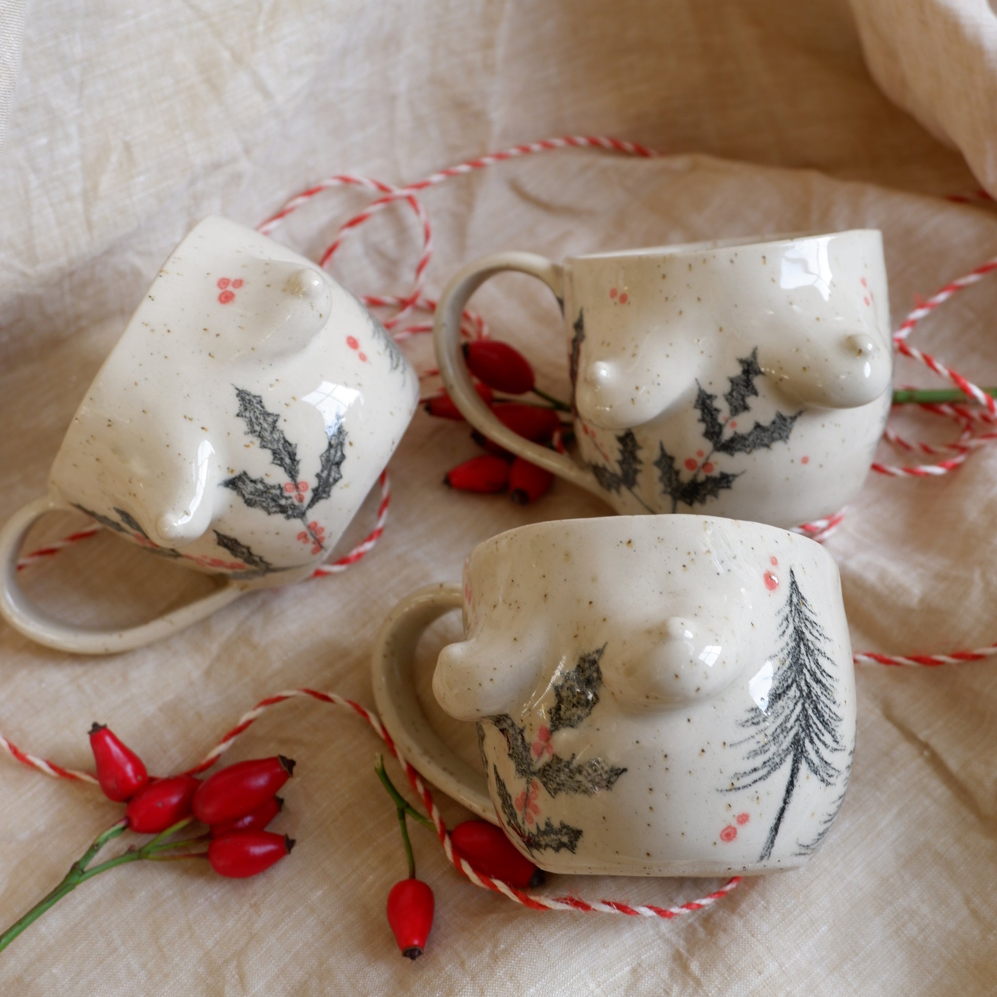 Picture yourself wrapped in a warm blanket, sipping your favorite holiday drink, while soft winter light fills the room, you're holding a mug that’s just as special, handcrafted from beige clay using the pinch technique, and gently decorated with hand-drawn pine trees and holly, capturing the magic of the season.