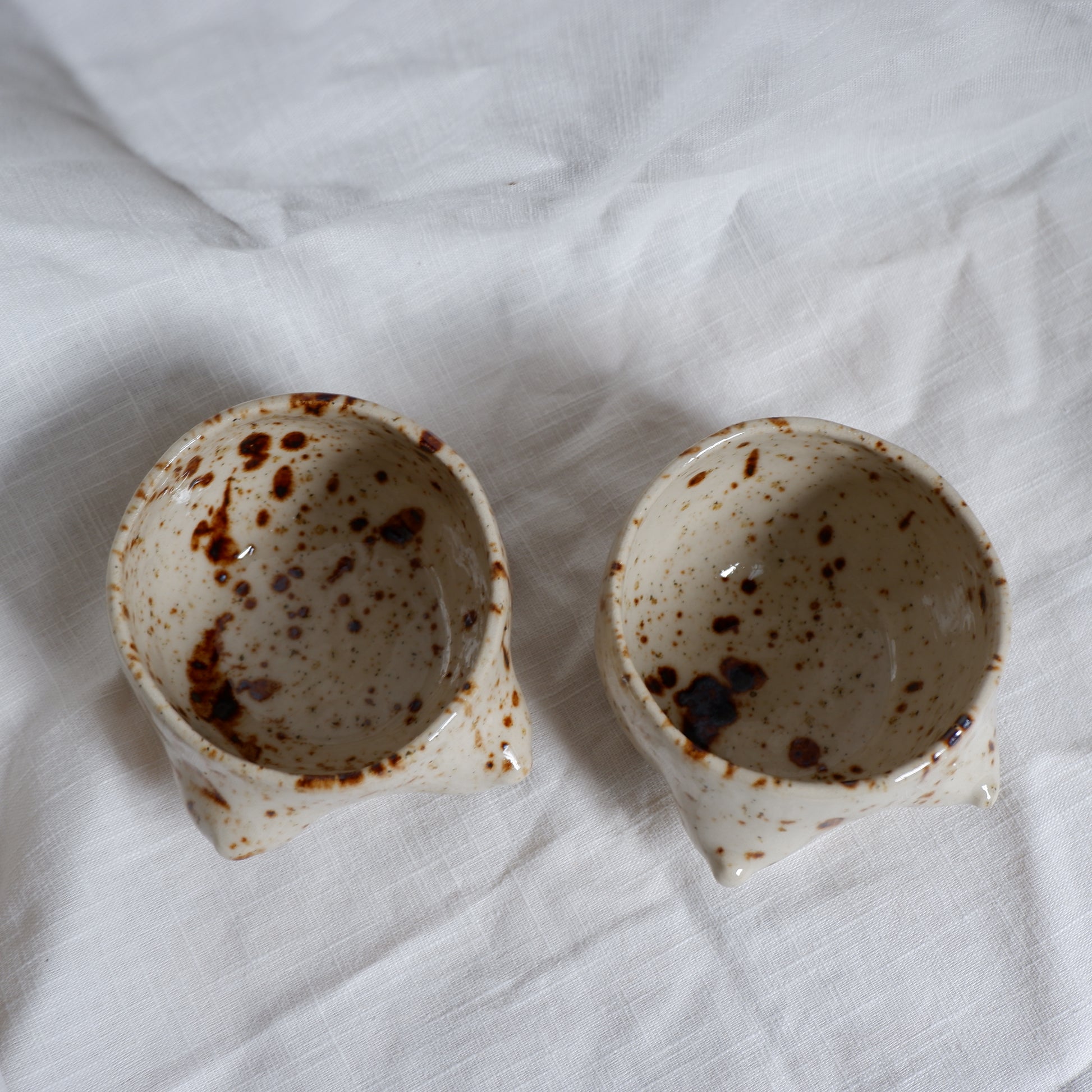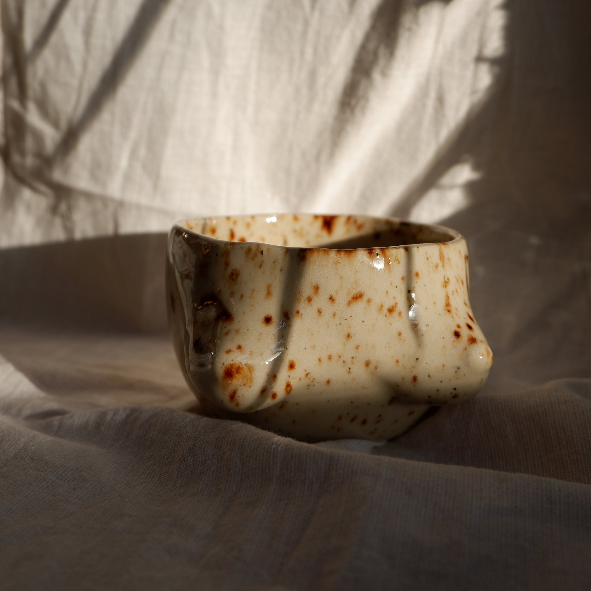 Shaped slowly by hand with the pinch technique from beige clay. Splashed by hand so each mug has its own character. On the unglazed bottom, you’ll find my signature as a small reminder of the hands that made it.