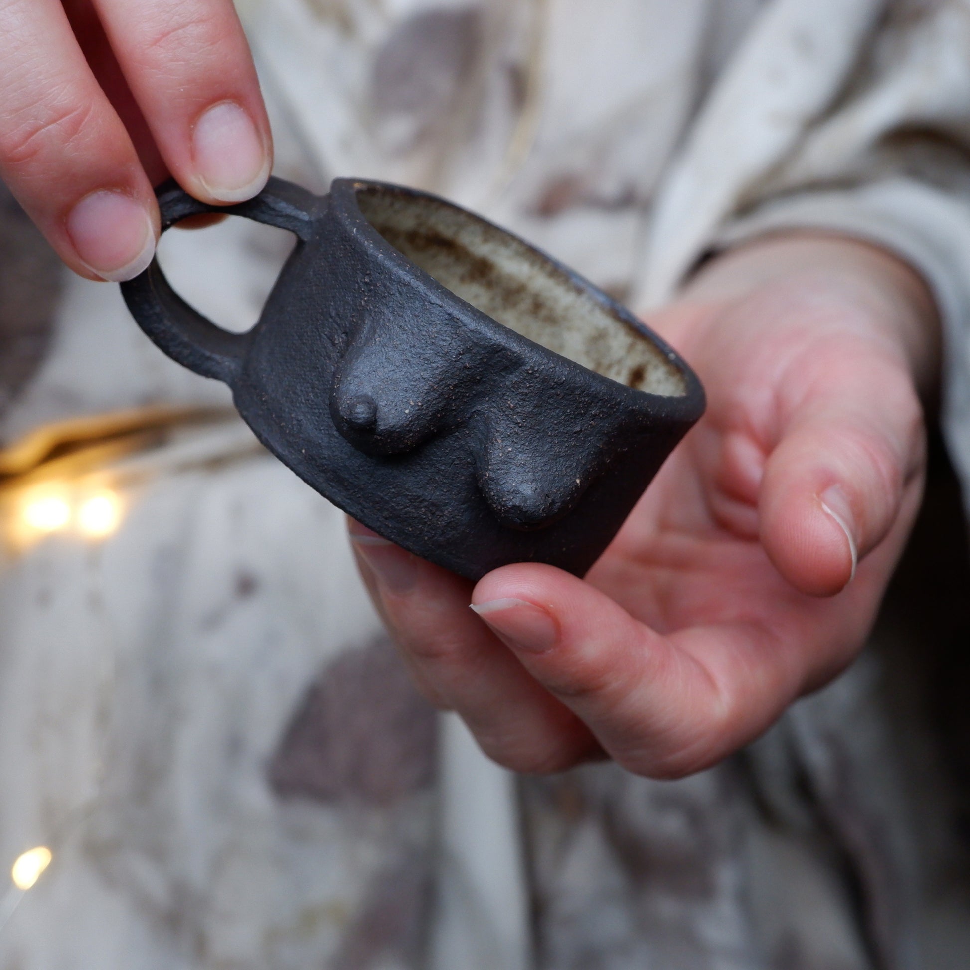 The holder is made from dark clay and measures 6 cm in diameter and 3 cm in height (without handle).