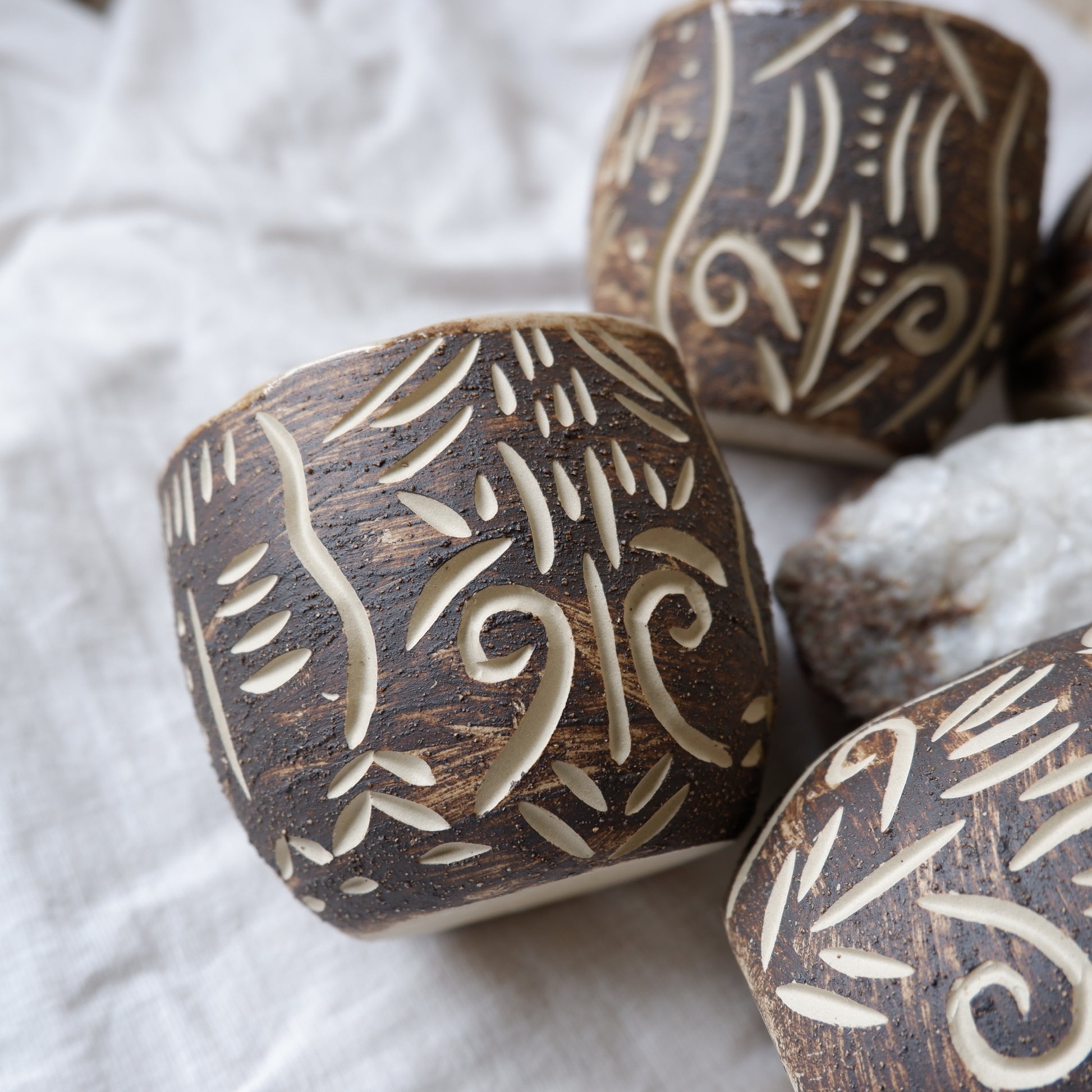 The mix of brown and beige clay brings out the raw, earthy character of each piece and invites a moment of stillness.