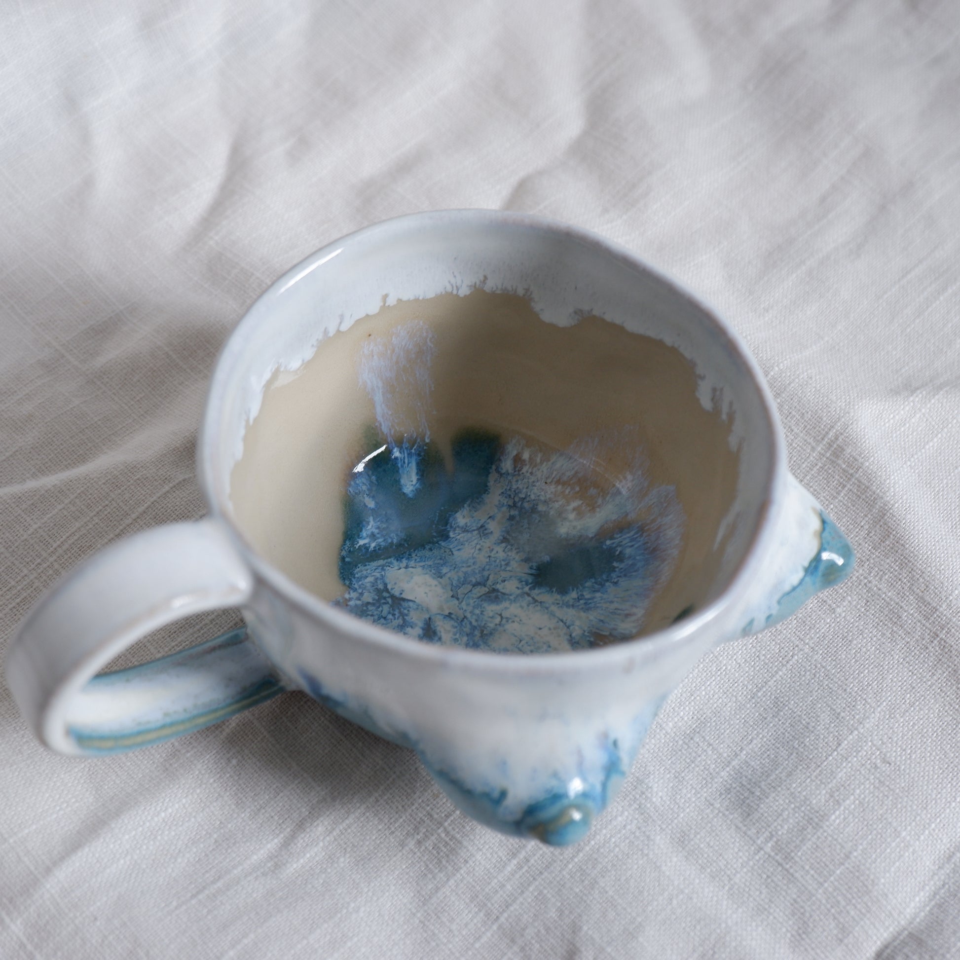 Shaped slowly by hand with the pinch technique from beige clay. The glossy glazes flow together in their own natural rhythm, giving it a character that can’t be repeated. On the unglazed bottom, you’ll find my signature as a small reminder of the hands that made it.