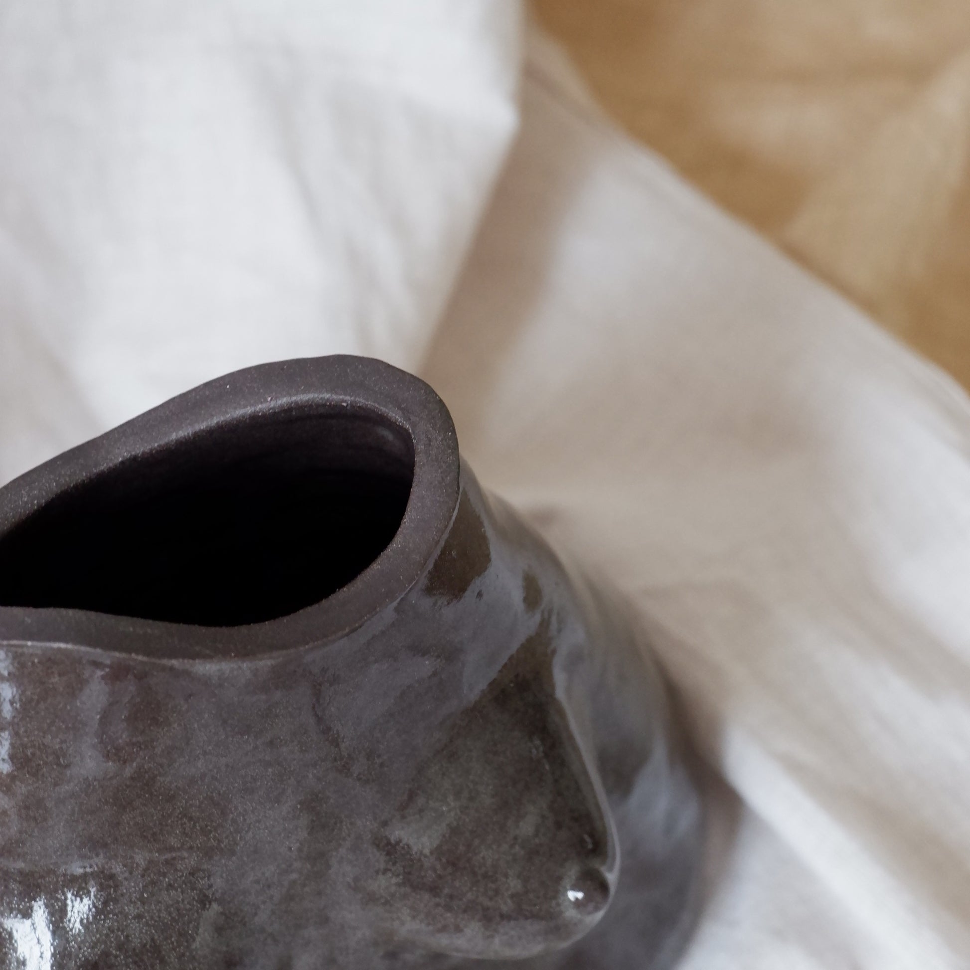 The vase is handmade with a coil building technique from black clay and it's finished with transparent glaze, and is fully watertight, suitable for fresh flowers.
