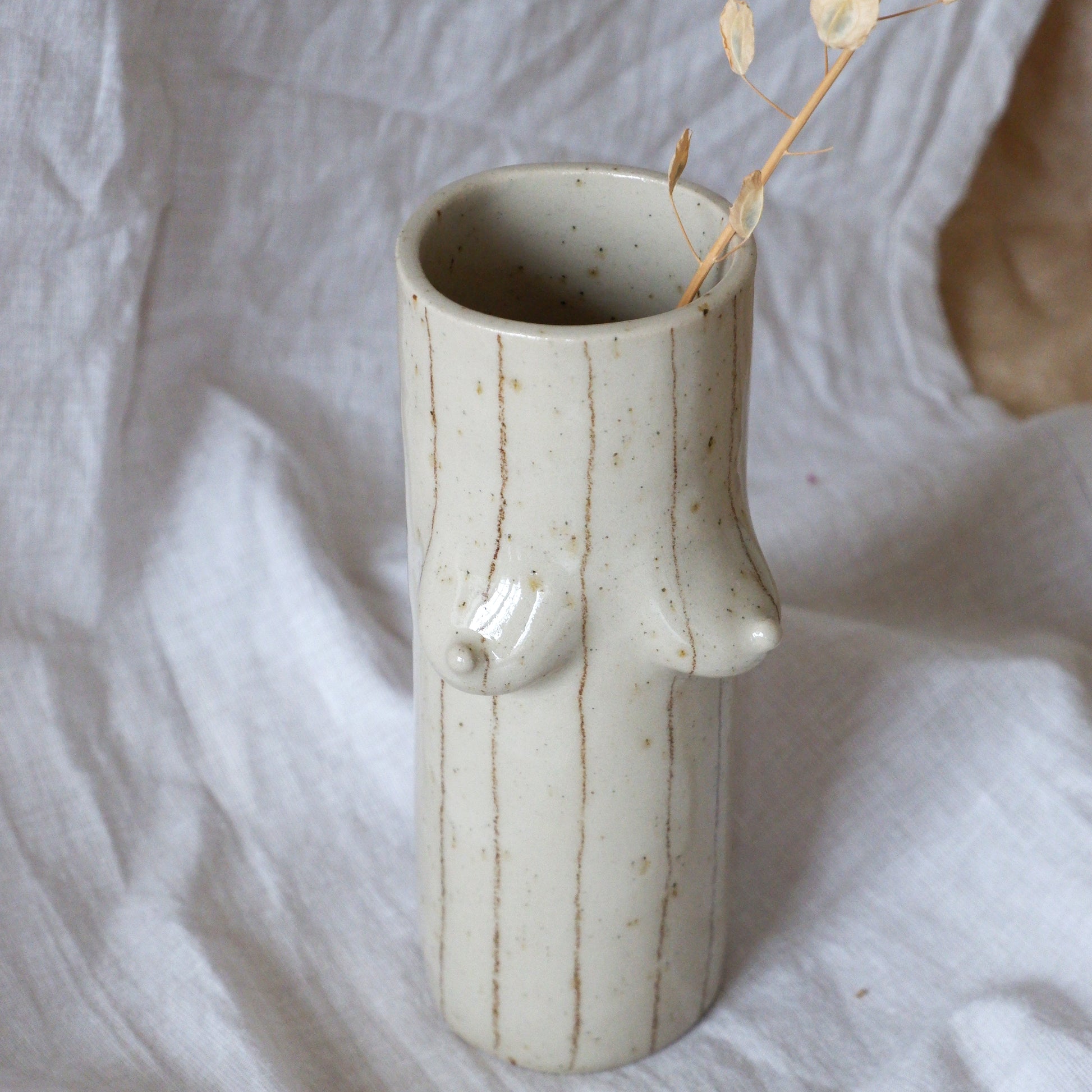 The vase is handmade with a slab building technique from beige clay and it's decorated with brown pencil stripes drawn by hand and finished with transparent glaze.