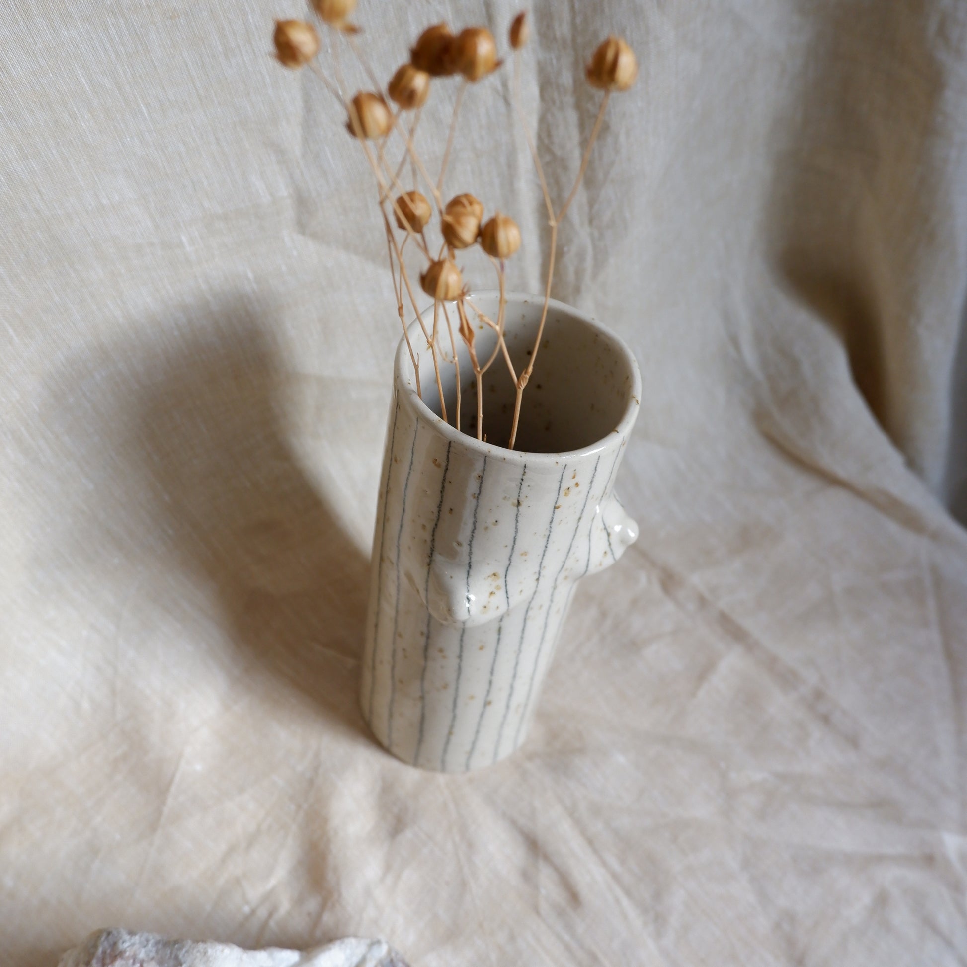 The vase is handmade with a slab building technique from beige clay and it's decorated with black pencil stripes drawn by hand and finished with transparent glaze.